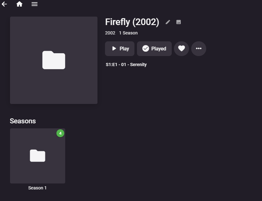 Zelbinian 4 Posted July 2, 2023 Posted July 2, 2023 I've added a few shows to the server now with no issues... until now. For some reason it doesn't like Firefly! Can anyone tell me what I'm doing wrong? Here is what I have done, in order I have named the show the same as I have others that Emby has processed correctly: {TV Folder}/Show Name (Year)/Season #/Ep - Title I attached a screenshot showing the folder/file name structure that also captures the files from another show that Emby correctly processed. I have also attached what the result is in Emby After it didn't upload automatically, I manually linked TheTVDB. When That didn't work, I also manually linked IMDb and a few others. I manually requested Emby refresh the metadata (including allowing it to replace pictures) I would attach a log but Emby did not seem to create one after I requested the metadata refresh.