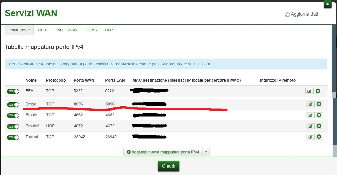 Hispanico957 23 Posted July 13, 2023 Posted July 13, 2023 (edited) 23 minutes ago, pwhodges said: If you disable uPNP in either (or both) of Emby and the router, you then need to add the IP address and port mapping into the router manually. In English this is commonly referred to as "port forwarding" or "port redirection". Doing this manually will mean you are no longer dependent on the behaviour of the uPNP system, which seems to be the source of your problem. Turning off uPNP in the router is an important security matter; you should only enable it if there is some software which requires it and doesn't offer an alternative. Paul In my case i have correct port forwarding, see screenshot..but form external it's impossible conncet ! Why this ??? I'm going crazy Hispa Edited July 13, 2023 by Hispanico957