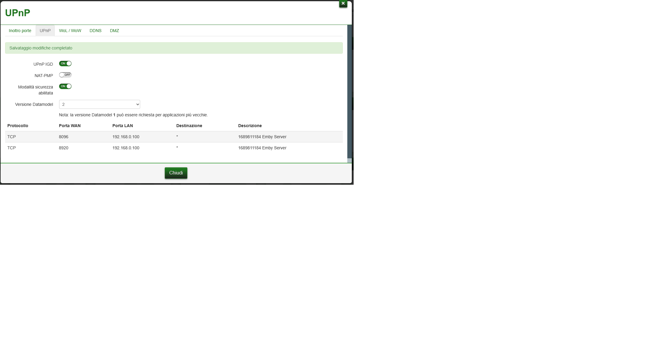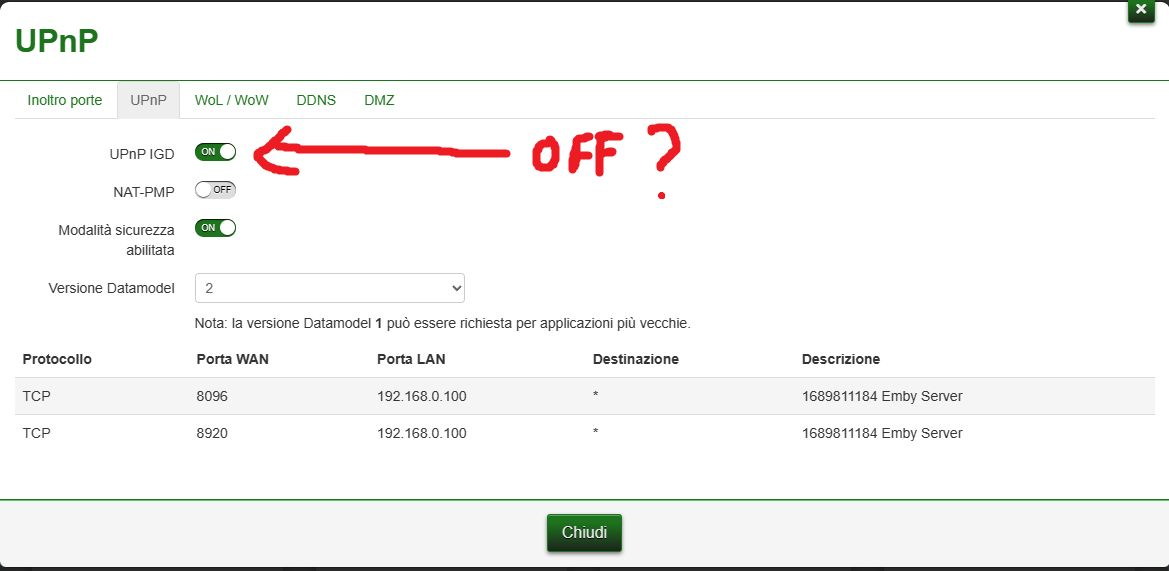 Super957 24 Posted July 13, 2023 Author Posted July 13, 2023 (edited) 2 hours ago, rbjtech said: Attivando "consenti connessioni remote" - emby ha richiesto nuovamente di riaprire le porte richieste utilizzando uPNP. WAN > 192.168.0.100 su 8096 e 8920 Come Luke ha dedotto, è "più sicuro" e più affidabile se si imposta MANUALMENTE il Port Forwarding. Fai esattamente lo stesso (cioè WAN > 192.168.0.100 ecc) e se non utilizzato per altri servizi esterni DISABILITA uPNP sul router. Disable uPNP you mean this ? Now i try agin and is impossible connect to server from external see screenshot, also is disable and re-enable "Allow remote connections to this Emby Server" PLS help me... Hispa Edited July 13, 2023 by Super957