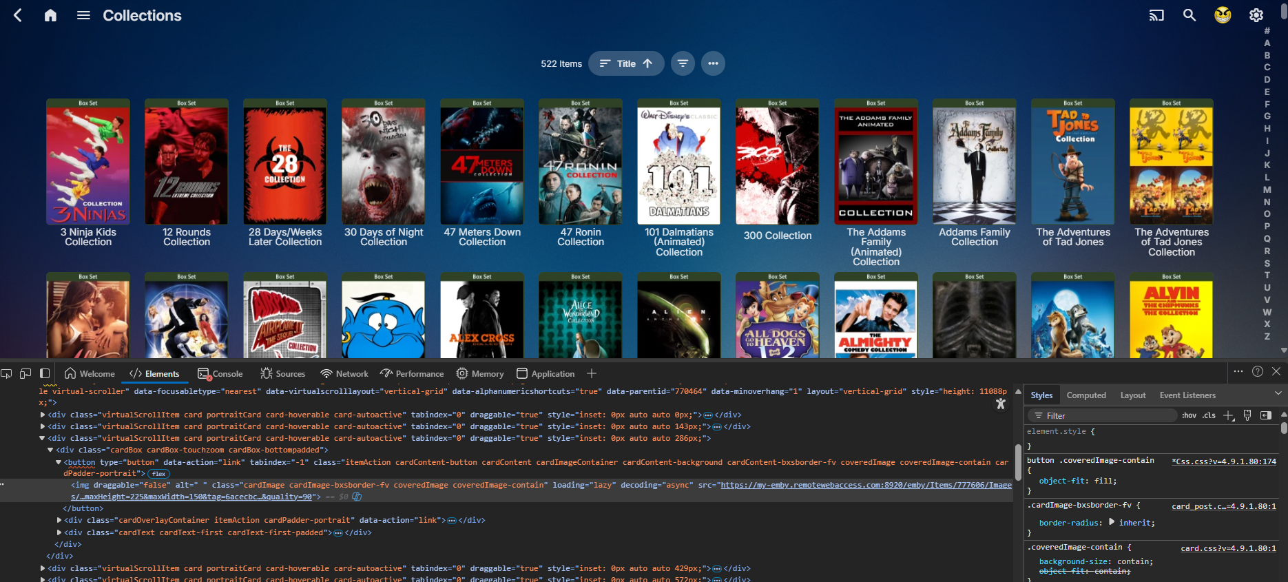 GrimReaper 4739 Posted October 3, 2025 Posted October 3, 2025 (edited) 6 hours ago, ebr said: Grim, can you confirm that the two different image types (boxset vs bluray for instance) are actually the same size/shape at the source? Meaning, if you find them in your imagecache folder are they the same or is the boxset actually different? [Typing from mobile so will need few posts->edits to put all the images in proper place, I'll put an "End post" at the bottom once done.] For context: all my Movie posters are provided locally and they all come in 580x829px res/2:2.86 AR (all obtained through RPDB Folders). When CoverArt treatment applied, image is downscaled to 574x800px; if Iconic treatment also applied, image is upscaled(?) to 800x1115px. AR not retained through neither enhancement. In the UI, they're displayed with borders all around, more pronounced at the right and bottom edge, with CA treated image having gray background and if Iconic applied, having black background (same is visible in enhanced-images cache folder): All collection images come from whatever Emby grabs from TMDB, majority in 100x1500px/2:3 AR: When CA treatment applied, it's downscaled to 650x900px, AR not preserved. In the UI, there are borders above and below the image: To summarize, neither Collections nor movie items look proper and currently CA treatments are unusable for me, as my OCD is going ballistic. This was really a chore, doing it on mobile. [End post] Edit: To add: depending on the CA treatment used, results are different: borders on all sides (Case, SideCase, ClearCase, ThickCase, SpineCase, CD), borders above and below (FlatCase) or placeholder fully filled (MetroCase) for movies - for Collections, it's still squashed. In summary: images are all over the place if treatment applied. In local Web app it can be mitigated with CSS, alas no solution for other client apps (apart your own AndroidTV app). Standard Android app exhibits same behavior as Web app, unusable. Edited October 3, 2025 by GrimReaper