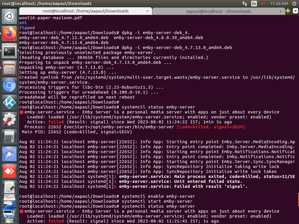 Ayush_92 0 Posted August 2, 2023 Author Posted August 2, 2023 (edited) I deleted using rm -rf and apt purge emby-server command. Also, I installed 4.7.13 version and below are screenshots.Only systemctl restart command can do active status but after a second goes inactive as I told you initially. Edited August 2, 2023 by Ayush_92