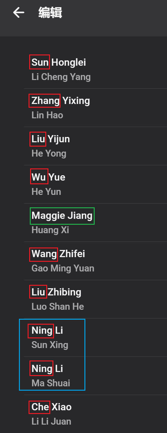 y29shi 8 Posted September 6, 2023 Author Posted September 6, 2023 On 04/09/2023 at 00:21, Luke said: Yea the issue is how did it happen, and that's what we don't know yet. found another strange case: in this show (imdb id: tt15199554), according to imdb, these two roles were played by two actors: First of all, In Chinese, we usually put family name at the front, followed by the personal name, but in English convention, the "first name" is actually the family name, "last name" is actually the peronal name. So these two actors' family names are Wu and Ning. I noticed that when the emby server recognizes a movie/show, if there's Chinese actors, it would display the actors' name in Chinese convention, unless that person has an English name: The name in the red boxes are all family names in Chinese and they are all in the front, and the name in the green box has the family name at the end. Now let's look at the two names in the blue box: the roles' names are Sun Xing and Ma Shuai (also in Chinese convention) but both of their actors' names are Ning Li, but according to the 2nd and 3rd pics in this post, only Ma Shuai's is actually played by Ning Li, Sun Xing is played by another actor named Xiaoliang Wu (in English convention). Therefore, I tried manually change Sun Xing's player to Wu Xiaoliang (because I want to use the same convention that emby server uses, this name doesn't consist of English name, so it should be in Chinese convention) and saved it. But after refreshing the page, then if I open the metadata again, I would see that the actor is changed back to Ning Li again (I tried locking the metadata as well). But I then tried to put the actor's name in English convention "Xiaoliang Wu" and saved it, then I can see that this information is indeed saved successfully (I opened the metadata after refreshing the page and the actor is now Xiaoliang Wu). I feel this is a really strange case because it seems failing to save the metadata only when I put the name in Chinese convention but not in English convention. I'm not sure if this founding can be useful to you.