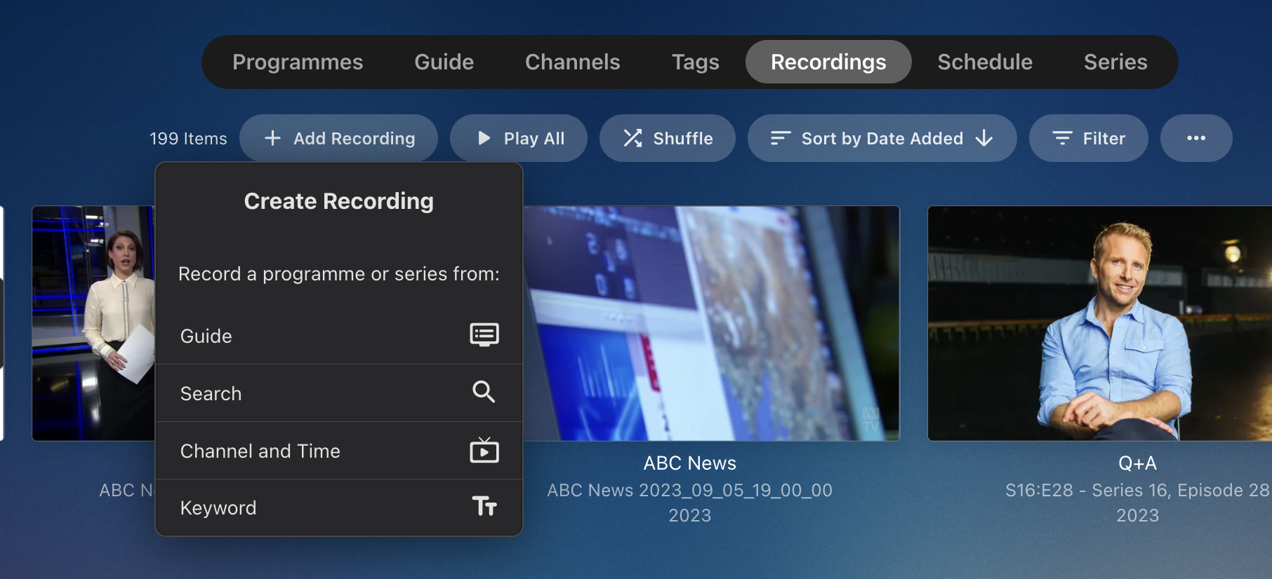 If I clicked on the Recordings tab before, I probably just saw the list of all my recordings, and didn't think "Add Recording" would be any different than going from the Guide (the default tab, and where I would schedule most recordings) or clicking Search.