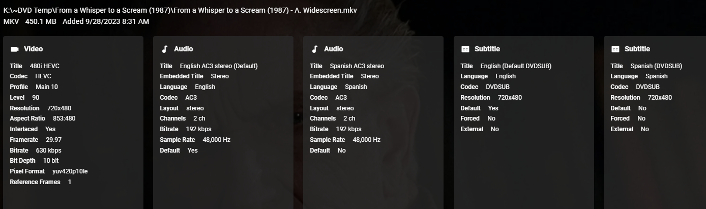 Ronstang 294 Posted September 29, 2023 Posted September 29, 2023 I read the article and I tried to put a couple movies in the same folder and it did not work. I included the following 2 movies: From a Whisper to a Scream (1987) - Fullscreen.mkv From a Whisper to a Scream (1987) - Widescreen.mkv And upon a file scan I end up with this: And then they show up in sub folders of the main folder even though I don't have them in separate folders. I can bork things us good....LOL