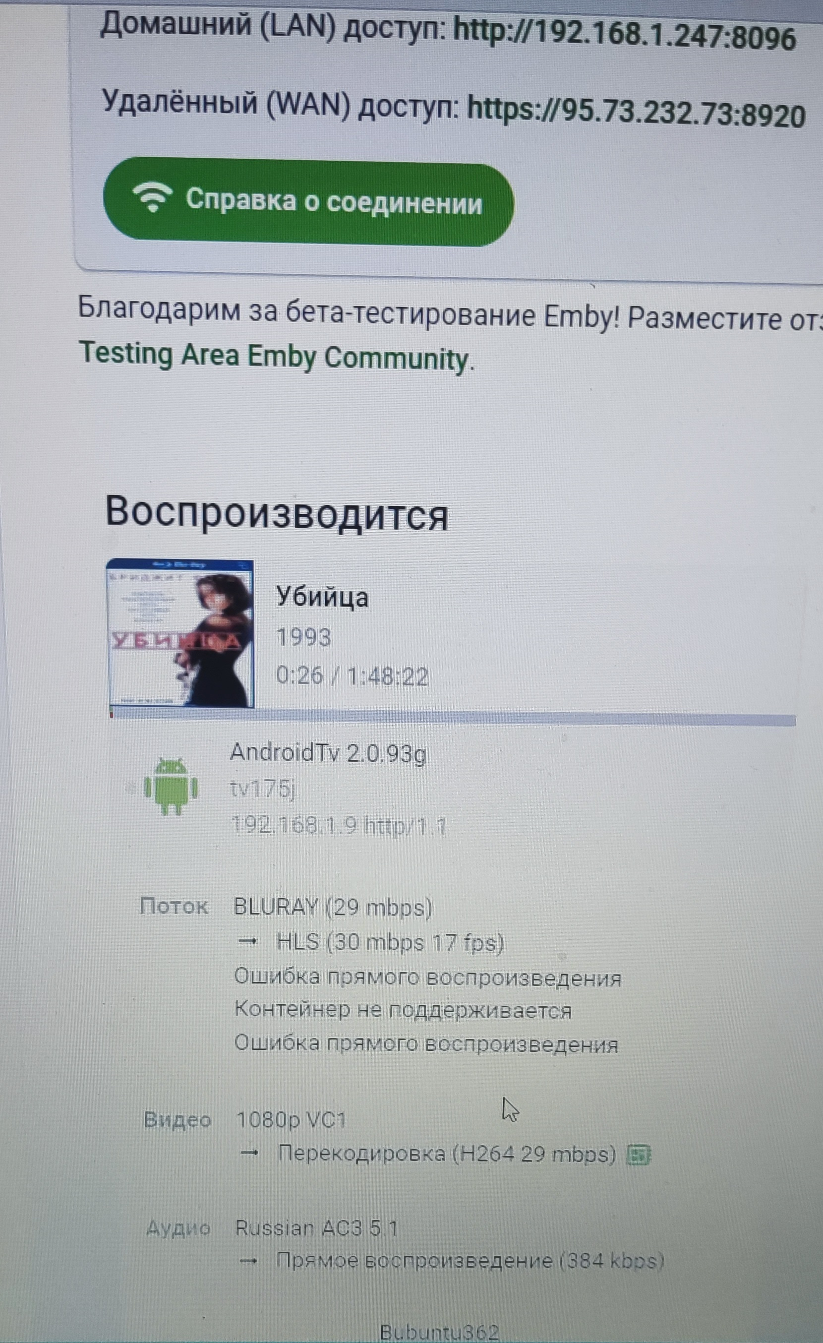 svyaznoy362 17 Posted October 19, 2023 Posted October 19, 2023 (edited) Hello everyone. I run Remux images of 1080 bdav, VC1 video codec. I use a beta server on ubuntu and on xpenology. I play this content on Android consoles: Nvidia shield 2019 pro, dune pro 4k 2 and homatic box 4k. He writes to me that there is a direct playback error and the server recodes it to mkv or hls. How to achieve direct playback so that the server does not recode. Edited October 19, 2023 by svyaznoy362