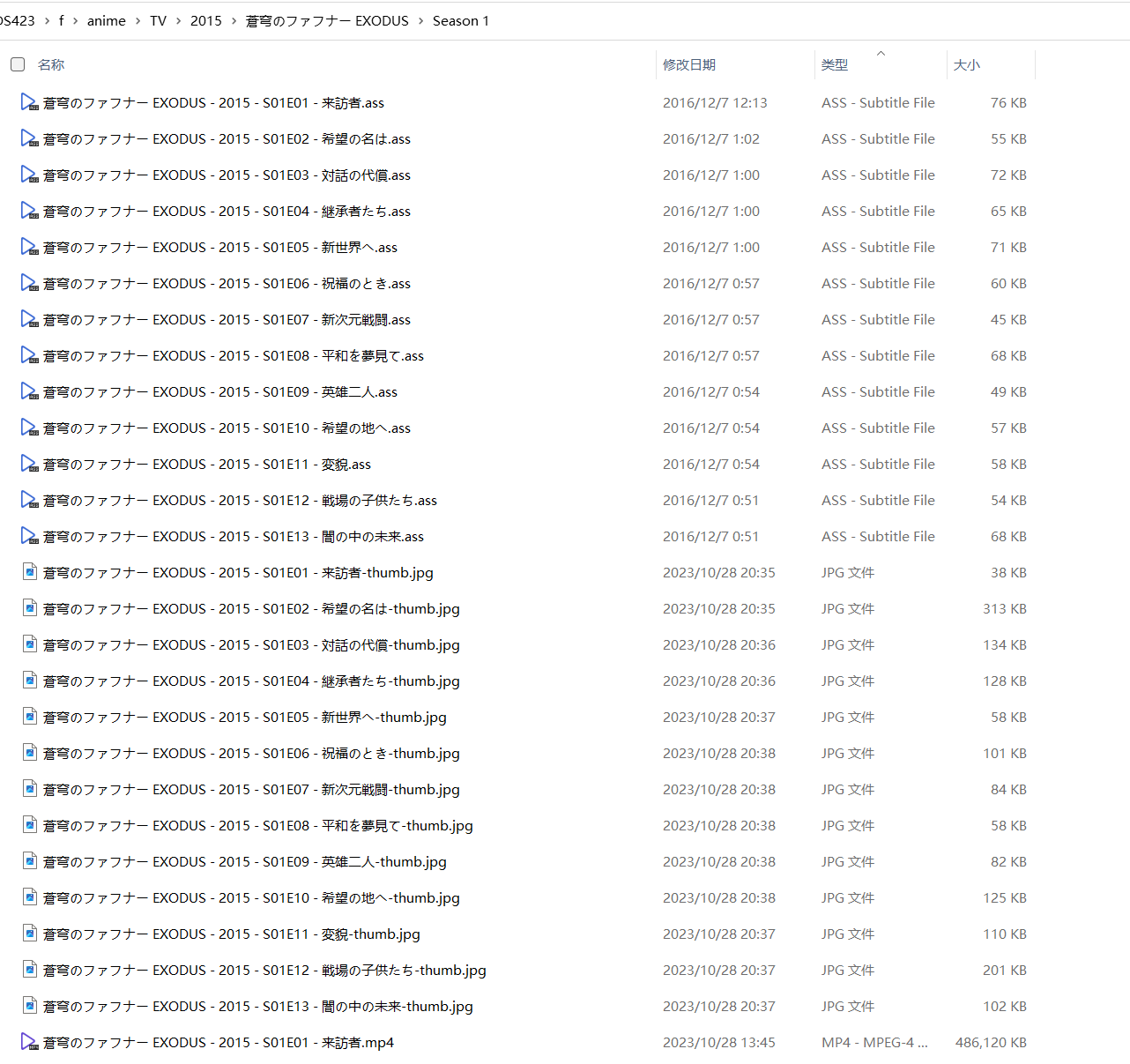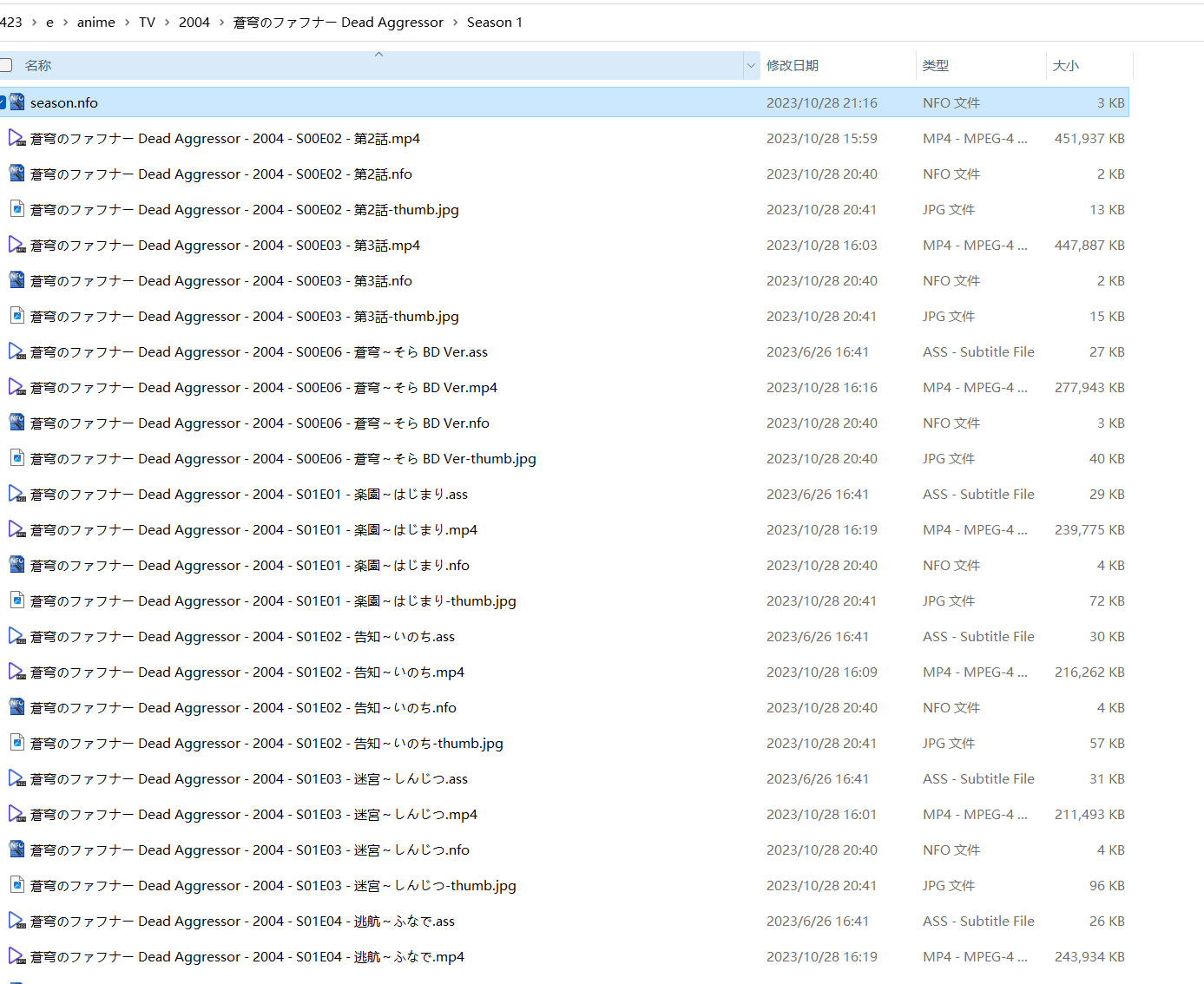Solution GrimReaper 4744 Posted October 28, 2023 Solution Posted October 28, 2023 (edited) Ok, remove all three series from TV shows root. Scan media library to clear db. For DEAD AGGRESSOR: 1) Move those S00Exx episodes out of Season 1 folder to Season 0 folder 2) Rename series folder to: 蒼穹のファフナー Dead Aggressor (2004) [tmdbid=42836] For EXODUS: 1) Rename series folder to: 蒼穹のファフナー EXODUS (2015) [tmdbid=25891] For THE BEYOND 1) No screenshot of Season 1 folder contents but if any Specials within, follow 1) from DEAD AGGRESSOR 2) Rename series folder to: 蒼穹のファフナー THE BEYOND (2019) [tmdbid=95336] Delete any existing NFOs present in either series/season folder, if any. Move all three series folders back under TV shows root. Scan media library. Edited October 28, 2023 by GrimReaper 1 1
