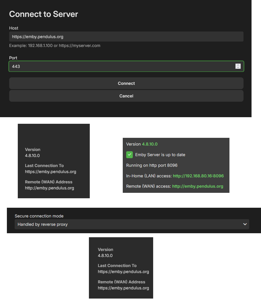 jgauthier 13 Posted October 24, 2024 Author Posted October 24, 2024 I am using a reverse proxy, it terminates SSL and then forwards to emby on HTTP. I checked my nginx logs for this hit and I can see everything is attempting to use HTTP and then redirected to HTTPS. This could be the problem with POST, but it's definitely not what I want... I know I set up emby connect up with HTTP: But then when I look at the connection it's HTTP. Discovered it was getting this info from the server itself. Found this setting , I haven't seen before and set it: NOW, it shows all HTPS. I will retry the Alexa integration when I am home in the evening. Thanks!