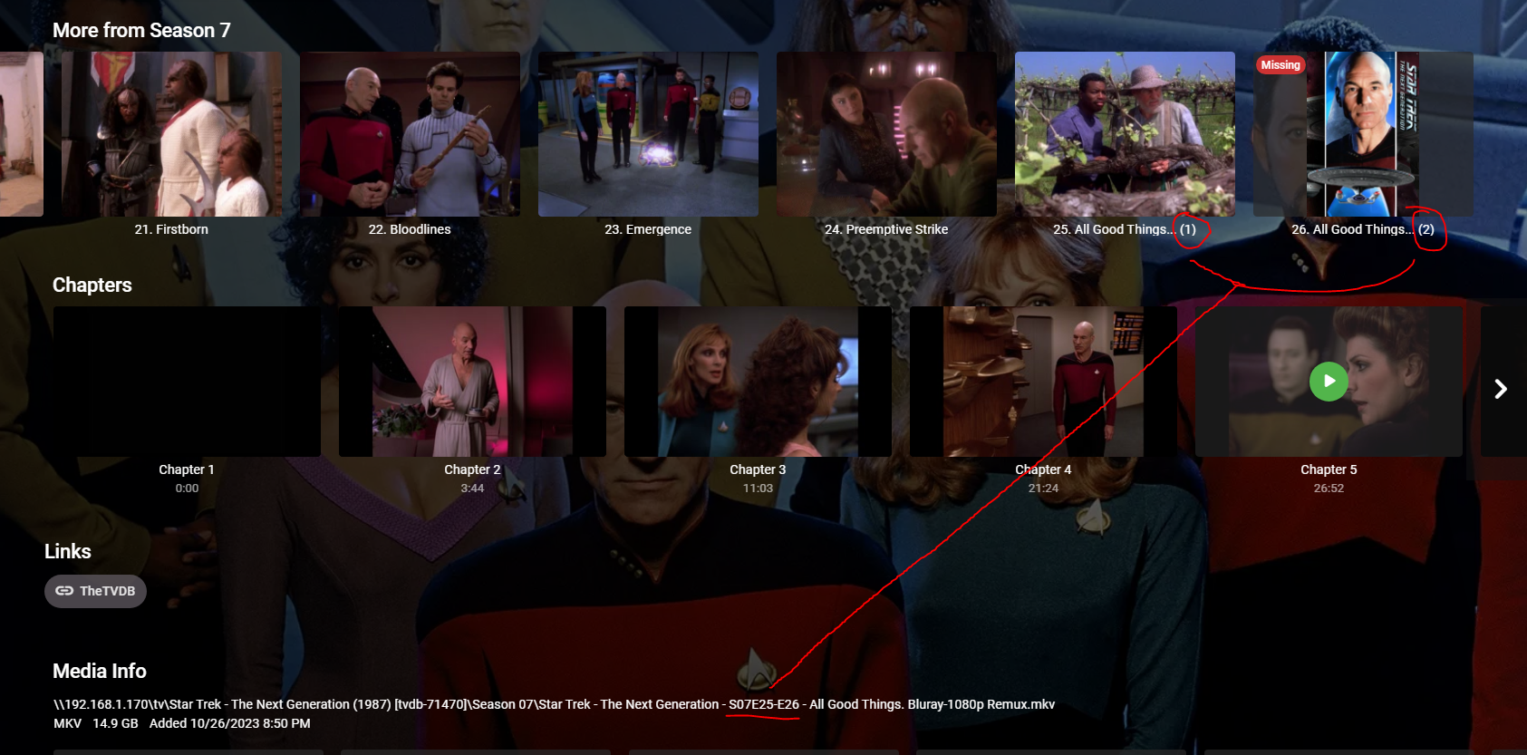 solidsnakex37 55 Posted November 19, 2023 Posted November 19, 2023 I have this issue fairly frequently and I don't seem to get what the issue is. Reading the documentation, you can use the following formats. https://emby.media/support/articles/TV-Naming.html#multi-episode-files Below, it's using one of the listed examples: S01E02-E03 episode name.ext What am I missing? Why is it not merging the two episodes?