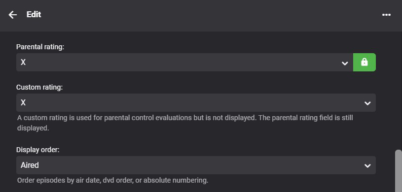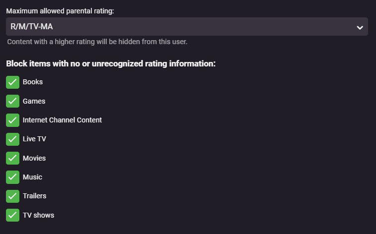 GrimReaper 4744 Posted December 5, 2023 Posted December 5, 2023 I can reproduce this on stable 4.7.14.0. for TV shows. None of the >TV-MA ratings (NC-17, AO, RP, UR, NR, X, XXX) prevents item showing in Home Screen Latest row (while it does in Library view), neither does blanking out Rating field with "Block items with no or unrecognized rating info" enabled. For Movies it works as it should, item is not shown on Home Screen. 1