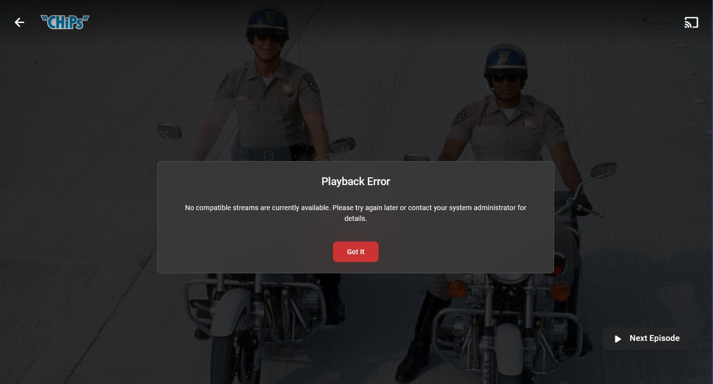 brucearp 1 Posted December 11, 2023 Posted December 11, 2023 Hi, I am getting the the following error when trying to play a live tv recording. It happens on both browser playback and playback on roku: "Playback Error No compatible streams are currently available. Please try again later or contact your system administrator for details." The file is a .ts file that needs to be transcoded before it can be played back. If I convert the file to an MP4 it is fine. I have attached the Emby server logs, the transcoding logs with debug mode enabled and a screenshot of the error. I do have a Premiere license as well. Any help would be appreciated. Thanks Bruce ffmpeg-transcode-349973c6-1e6a-4080-b982-3ac83cfb580e_1.txt ffmpeg-transcode-a4d4e962-49ae-442e-b053-348b00e6a003_1.txt ffmpeg-transcode-c838925e-e6bd-4549-ba37-e93d06d4936c_1.txt ffmpeg-transcode-ec36b6bd-552a-4238-886d-d3c4a61b89a0_1.txt hardware_detection-63837900920.txt embyserver.txt ffmpeg-transcode-0ff15ae0-75de-4619-947c-50d3be2361d9_1.txt ffmpeg-transcode-02bfd44b-c1dc-490c-adc5-2e5c818512c4_1.txt ffmpeg-transcode-6cda01a8-2f54-4c8d-9815-2cfaf2b6138f_1.txt ffmpeg-transcode-1761a9e0-d2d0-4aa2-baf1-ccd87d324276_1.txt ffmpeg-transcode-7638a612-5474-4c49-bed6-ffd515b9a0d7_1.txt