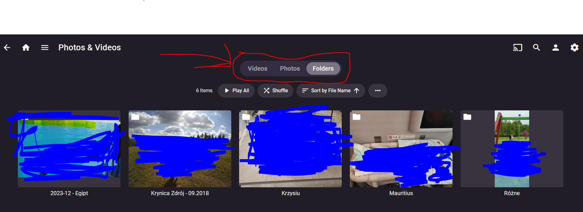 marekchr 0 Posted December 17, 2023 Posted December 17, 2023 Hi all, I've just started my journey with Emby which looks really good, but I do have one issue and not sure if it's something what I'm doing wrong or maybe it's a bug. My main point of using Emby is for photos and videos of our family, so I've created a library "Photos & Videos". In this folder I have a lot of more folders and subfolder, so the structure looks like this: Photos & Videos: - 2022 - Abc - Def - 2023 - Ghj - Jkl - Qwe When I get into "Photos & Videos" I can select if I want view only Photos, Videos or Folders, but when I got into any deeper folder, so e.g. 2022, 2023, Ghj etc, I don't have anymore those filters (Attached screenshots). Is there any reason I cannot filter by Video / Photo in subfolders? Screenshots - screen1.png is "Photos & Videos", so main folder, screen2.png is a subfolder in "Photos & Videos". Circled in red the filters I'm talking about.