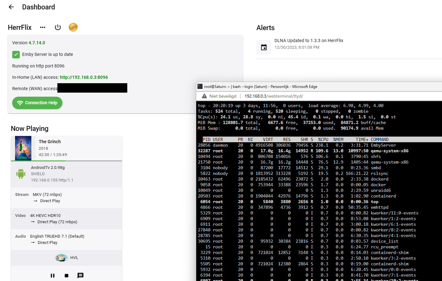 G4n0nD0rf 6 Posted January 1, 2024 Posted January 1, 2024 Hi and happy new year everyone! Two days ago I was watching a movie with Emby when all of the sudden playback hangs for a couple of seconds every few minutes. After a lot of troubleshooting I'm still experiencing the same problem with high bitrate (UHD bluray) files. Never had this problem before. I run Emby Server in an Unraid docker, which uses a lot of cpu (> 2 cores 100%) when playing such a file even though no transcoding takes place. Lower bitrate files also use more cpu than expected but don't seem to hang. I've noticed DLNA updated to 1.3.3 at about the time my problems started. I don't now if it's related. I disabled DLNA anyway because I don't use it but that doesn't solve my problem. It did lower CPU from about 30% to a few % of a core when nothing was playing. Any way to find out what's causing the high cpu? Any way to reverse the DLNA update?