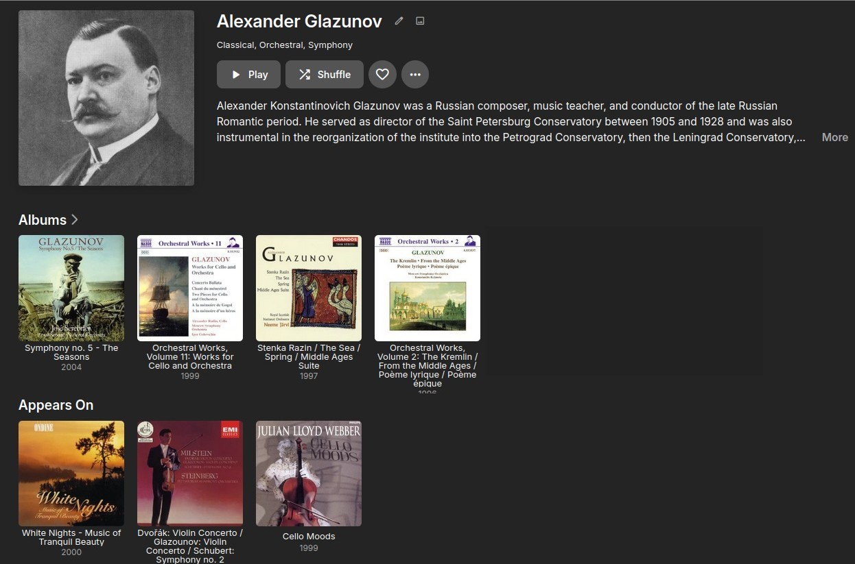 beckfield 173 Posted April 1, 2024 Posted April 1, 2024 In my Plex/Emby comparison chart above, I mentioned that Emby's support for Composer tags was "a huge first step." After spending some time with it, I'm seeing just how huge an advantage it is. I no longer have to misuse the Artist tag as a substitute for Composer. I thought this may be a little chaotic, since classical music albums can come in such different forms (soloist-centric, composer-centric, orchestra-centric, etc.), but after "fixing" a couple of albums to be tagged properly, it's coming together very well. The number of albums being stuffed into the "Various Artist" bucket is going down. There will always be some that belong there, but too many are there simply because they could not easily be categorized correctly. This is a game changer for the Emby web application, especially since you added the ability to make the Composer tab the default start page for a library, and with the "Appears On..." hub. When I look at a Composer's detail page, I see the albums that are specifically theirs, as well as other albums where any of their works appear. So, a huge "Thank you!" to Emby for adding these features. I'm eagerly anticipating this capability coming to the Android TV app (I use an nVidia Shield). 2 1