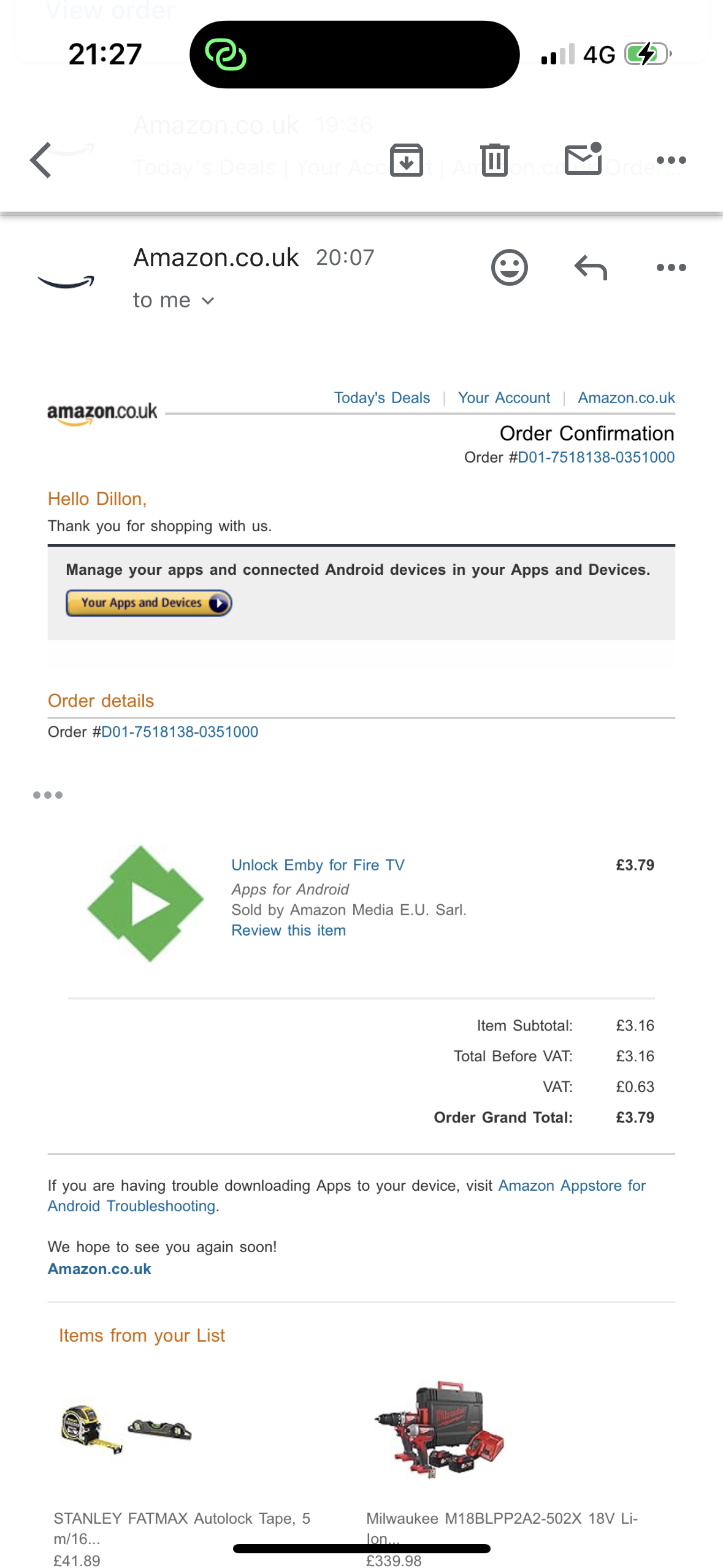Dillon97 0 Posted January 17, 2024 Author Posted January 17, 2024 I made the purchase through pop up suggestion on my firestick, just got confirmation email to my Amazon account, it just seems Amazon hasn’t communicated the purchase over to my firestick