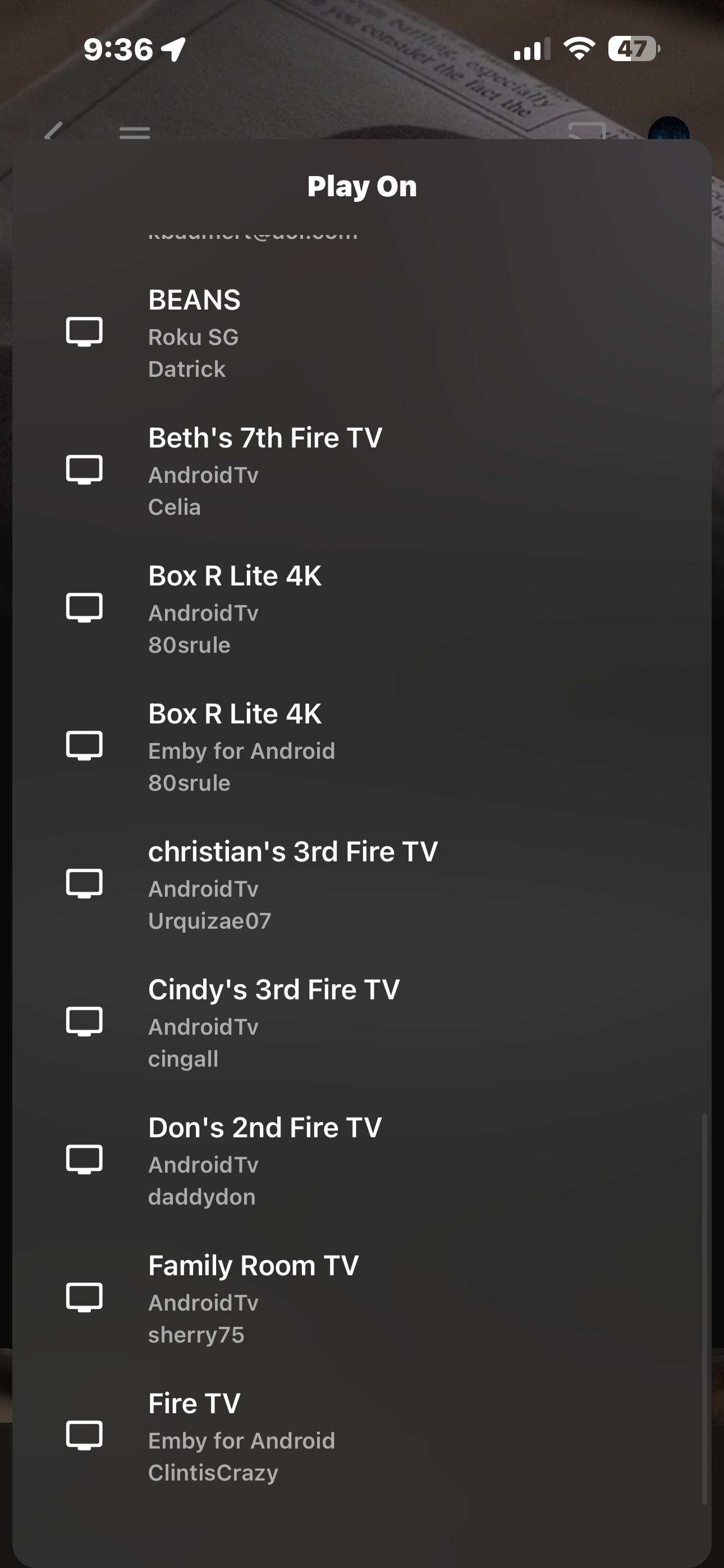 80srule 33 Posted January 28, 2024 Posted January 28, 2024 So when i was on work trip I wanted to cast/ Airplay from my emby app to the hotel tv. The hotel offers this I did the steps I can do it from my Apple Music and a variety of other apps. But emby shows a bunch of devices about 10 but stops at that and doesnt go further down the list. The tv was labeled Room 407 but the app would not go past L. None of these devices are mine in fact every one is a device labeled with one of my friends userID under it. Any reason I cant scroll any further? Or why other devices I have never seen or used and not even on my local network show up but a device on the local network doesnt?