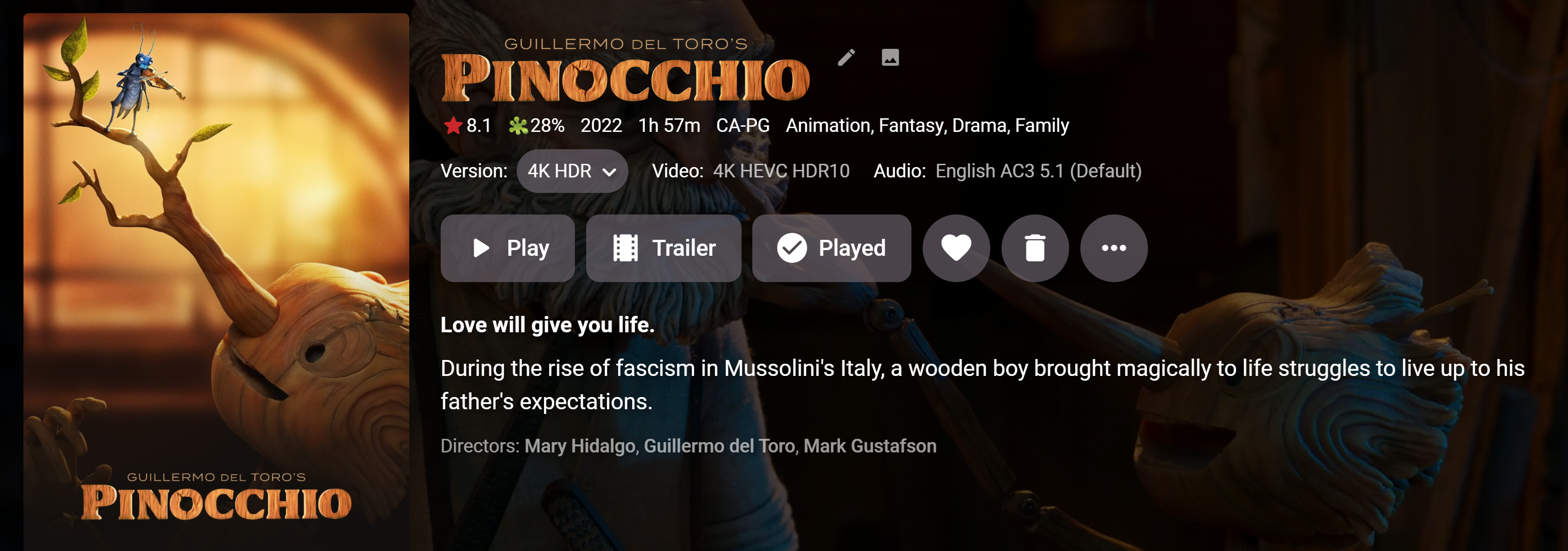 Taziuk 0 Posted January 31, 2024 Author Posted January 31, 2024 1 hour ago, GrimReaper said: It isn't, metadata available is for Guillermo del Toro's Pinocchio (2022). Same runtime, genres, tagline, overview, directors, logo as on TMDB. Guillermo del Toro's Pinocchio (2022) — The Movie Database (TMDB) (themoviedb.org) More likely that's an error on OMDb's part - incorrect link with the other Pinocchio movie - and subsequently shown in Emby. Would appear to be the correct answer. Unable to find any way to interrogate the OMDB plugin though.