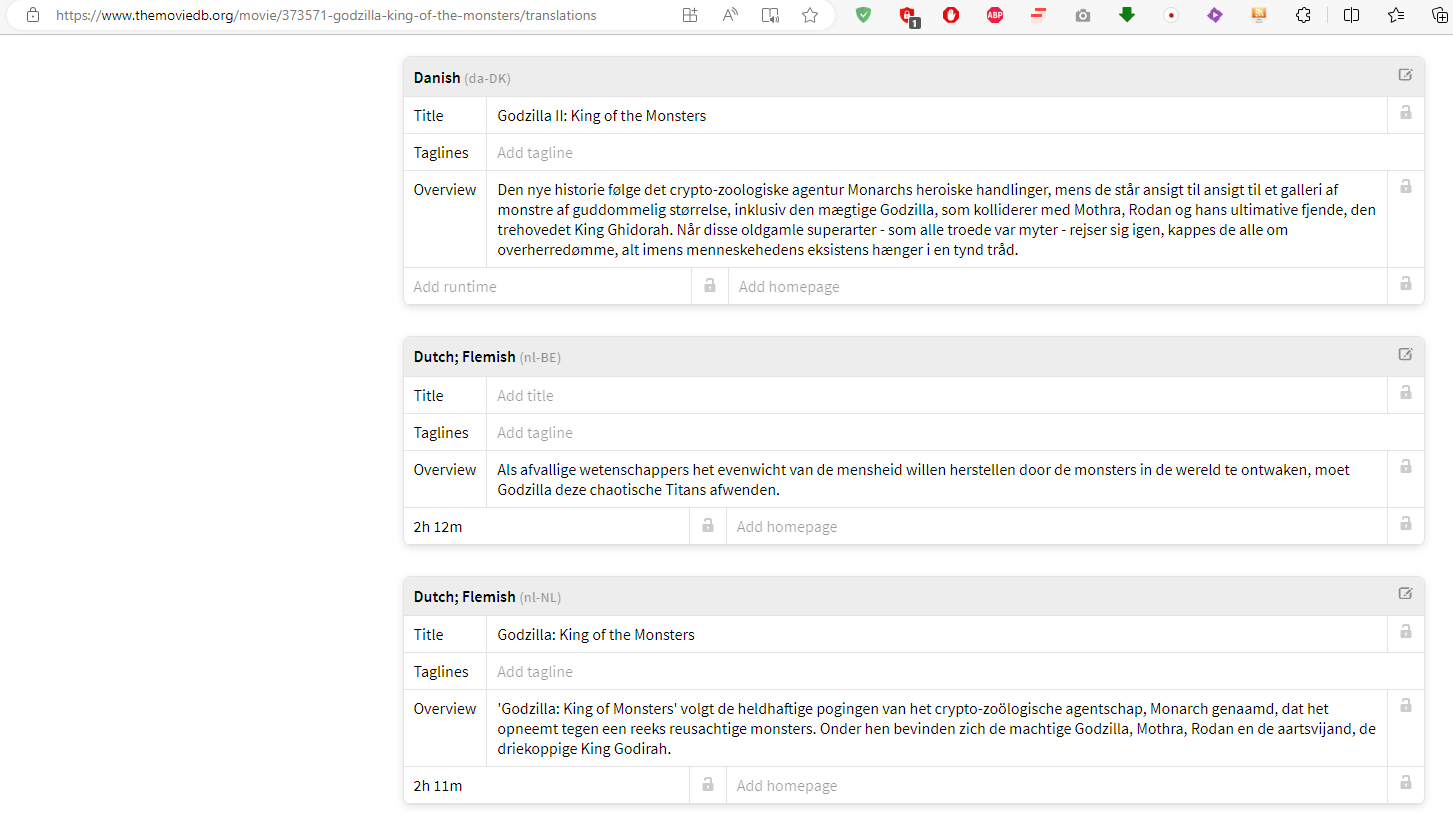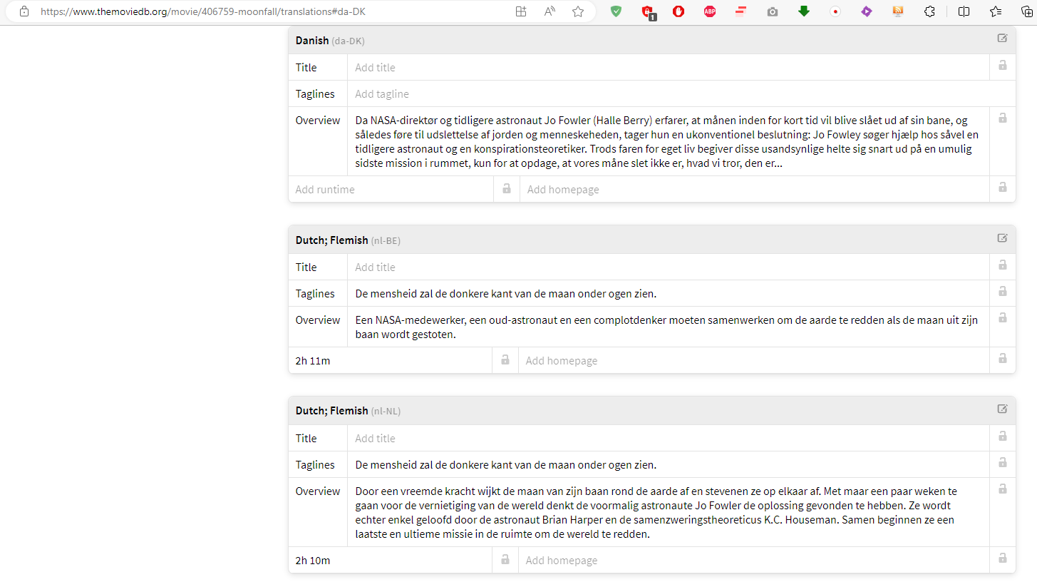 Solution GrimReaper 4742 Posted January 30, 2024 Solution Posted January 30, 2024 9 minutes ago, Ceten said: I noticed that for most of the movies added to my library in the last months the metadata is not in the language I set in the library settings. Language is set to 'Dutch': But the metadata for these movies is in English. For example 'Saltburn (2023)' is available on TheMovieDb with Dutch overview but looks like this (https://www.themoviedb.org/movie/930564-saltburn?language=nl): For some movies the overview is in English and the title in Chinese (original language of the movie): This is also available on TheMovieDb with a Dutch overview and English title : https://www.themoviedb.org/movie/535167?language=nl Change Country to Netherlands and Refresh Metadata>Replace all, as neither Saltburn nor The Wandering Earth have nl-BE translations (but have nl-NL). 14 minutes ago, Ceten said: A few examples of recent movies which were correctly retrieved in Dutch are: Moonfall (2022), Trolls Band Together (2023) and Godzilla - King of the Monsters (2019). All of those movies do have nl-BE translations, hence you're getting those.