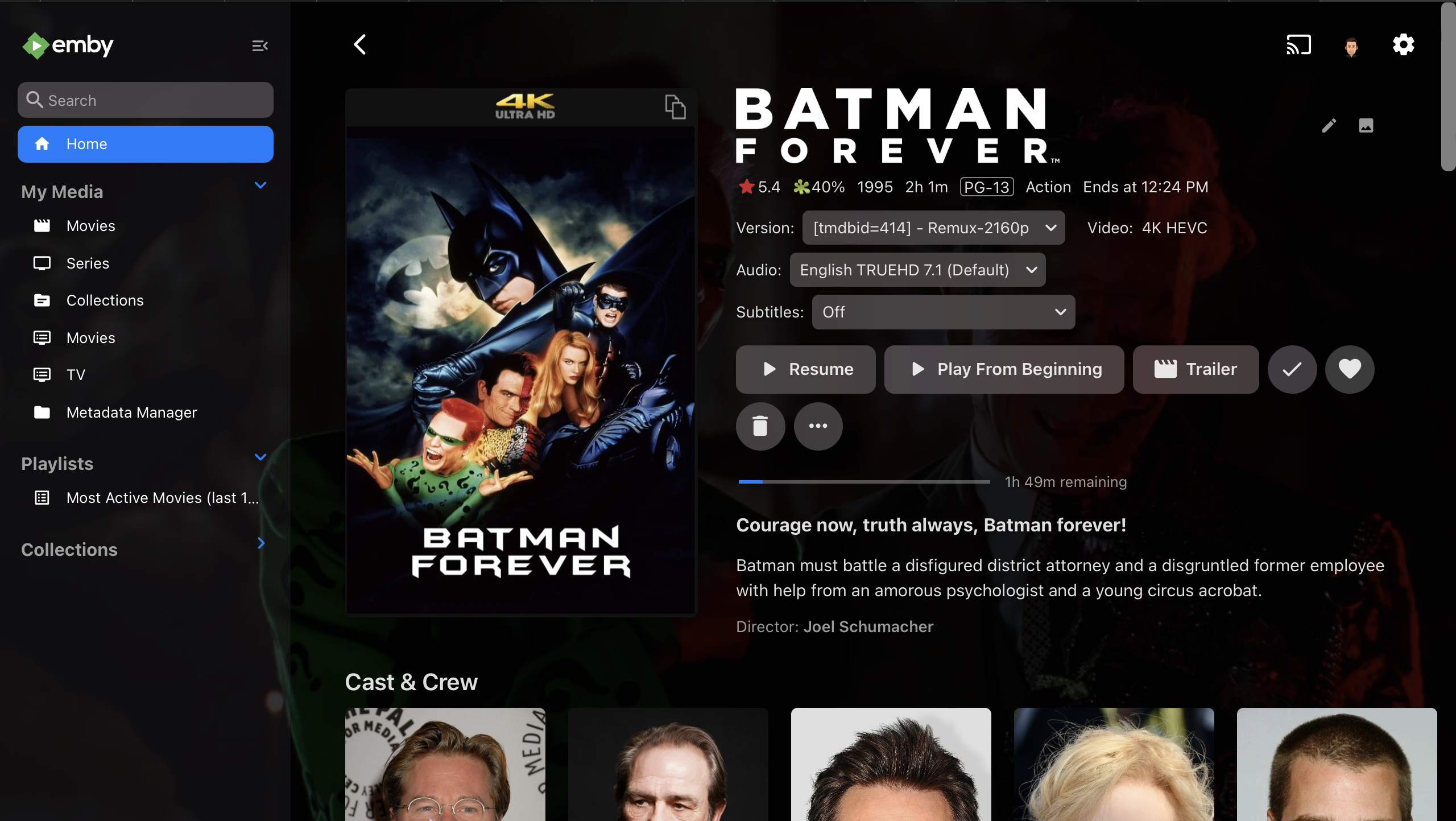 doug.dimick 13 Posted February 3, 2024 Posted February 3, 2024 I follow the Emby movie naming convention as documented at https://emby.media/support/articles/Movie-Naming.html. Example movie name I use is: Batman Forever (1995) [tmdbid=414] - Remux-2160p.mkv Before 4.8.80, the client would not display the tmdbid on the client's screen, but just "Remux-2160p" in the version dropdown. This is what I want. After 4.8.80, the client displays "[tmdbid=414] - Remux-2160p".