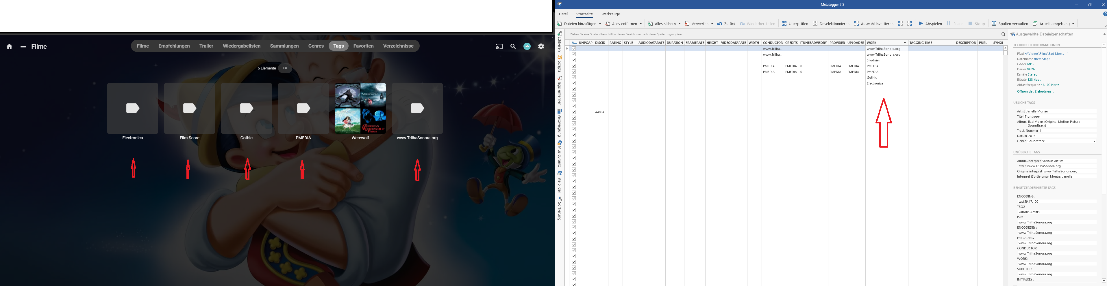 Solution oesi03 2 Posted February 22, 2024 Solution Posted February 22, 2024 (edited) On 2/12/2024 at 8:38 AM, Painkiller8818 said: Hi, yes exactly, i scanned the library a few times but as those elements normally not show up in any library i can't update those files. Theme.mp3 files normally should be ignored from analyze as media file in the normal way as they are just background sounds. There is no option for me to update or edit them with metadata editor, as i have to select a library in which i wanna edit items, and i can't do this for theme songs. Thanks Hatte dasselbe Problem wie du. Lösung: 1. Verschieben "aller" theme.mp3 (sofern man nicht weiß welche der Auslöser sind) an einen neuen Speicherort. Beim Verschieben darauf achten dass, die Verzeichnisstruktur erhalten bleibt. Sonst wird eine spätere Zuordnung schwer. 2. Emby-Server neu starten und Bibliothek scannen. So in Etwa in "geplante Aufgaben" -> "Library" -> "Scan media library" manuell ausführen. Warten bis der Scan durchgelaufen ist. Dann sollten die leeren Tags verschwunden sein. 3. Entfernen aller Metadaten Informationen der theme.mp3 ("titel; artist; album; date" werden zwar nicht benötigt. Können aber theoretisch erhalten bleiben.) Dazu kann man zum Beispiel verwenden "Metatogger"; "Mp3tag"; "Metadata++" <- alle kostenlos. Bei mir waren die betreffenden strings enthalten in den Metadaten-tags "WORK" und "Stimmungen". Wobei, der Metadaten-tag "Stimmungen" von keinem einzigen Metadaten Programm erkannt und angezeigt wurde. Lediglich mit der Windows Funktion "Eigenschaften" -> "Details" -> "Eigenschaften und persönliche Informationen entfernen" konnte ich auch die ganz einfach loswerden. 4. Zurückschieben aller theme.mp3 sofern die Echtzeitüberwachung eingestellt ist sollte Emby automatisch alle neu einlesen. Ansonsten "Scan media library" manuell ausführen. Eine manuelle Bearbeitung der Datenbank wollte ich auch vermeiden. Bevor etwas schief geht und ich alles neu einlesen muss. Da die Bearbeitung der theme.mp3 eh notwendig ist. Sollte das der beste Ansatz und auch von jedem ohne große Kenntnisse durchführbar sein. Toller Nebeneffekt: ich konnte auch gleich alle defekten theme.mp3 identifizieren die immer wieder zu Abspielproblem führten. _______________________________________________________________________________________________________________________________________________________________________ Had the same problem as you. Solution: 1. Move "all" theme.mp3 (unless you know which one is the trigger) to a new location. When moving, make sure that the directory structure is preserved. Otherwise, later assignment will be difficult. 2. Restart Emby server and scan library. Something like "Scheduled Tasks" -> "Library" -> "Scan media library" Manually! Wait until the scan has finished. Then the empty tags should be gone. 3. Remove all metadata information from the theme.mp3 ("title; artist; album; date" is not required. But can theoretically be retained.) For this you can use, for example, "Metatogger"; "Mp3tag"; "Metadata++" <- all free. For me, the strings in question were contained in the metadata tags “WORK” and “Stimmungen”. The metadata tag “Stimmungen” was not recognized and displayed by any metadata program. I was only able to get rid of them easily using the Windows function “Properties” -> “Details” -> “Remove properties and personal information”. 4. Pushing back all theme.mp3. If real-time monitoring is set, Emby should automatically re-read them all. Otherwise, run “Scan media library” manually. I also wanted to avoid manually editing the database. Before something goes wrong and I have to rebuilt the entire database. Since editing the theme.mp3 is necessary anyway. This should be the best approach and can be carried out by anyone without much knowledge. Great side effect: I was also able to immediately identify all the defective theme.mp3s that repeatedly led to playback problems. Edited February 22, 2024 by oesi03 1
