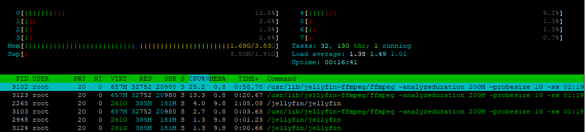 lexm8 1 Posted September 7, 2024 Posted September 7, 2024 On 9/3/2024 at 12:52 AM, softworkz said: A 4k video has 8 times the horizontal and 8 times the vertical resolution. This means that the amount of data to process is 64 times more than in this example. The transcoding speed is around 25 fps (same like the video), so that's already the absolute minimum in order to do live transcoding. Thought I'd just jump in here, currently running Jellyfin on Ubuntu 22.04 in Docker on a Rock5C Lite (RK3582 converted to RK3588S2 by unlocking the disabled cores & GPU) with HWA using the VPU and I'm transcoding Interstellar from 4K HEVC at 68 FPS with subs on. FFMPEG CPU usage looks to be averaging 20-30% would love to see some more work here on the RK3588 as this thing looks like an absolute powerhouse for the price & power usage. I think I've attached the correct FFMPEG logs however if it's not, just point me in the right direction & I'm happy to get whatever. FFmpeg.Transcode-2024-09-07_16-06-48_65b250eabcbe17a66b42759ae8b8a72f_4fbb6401.log.txt 1