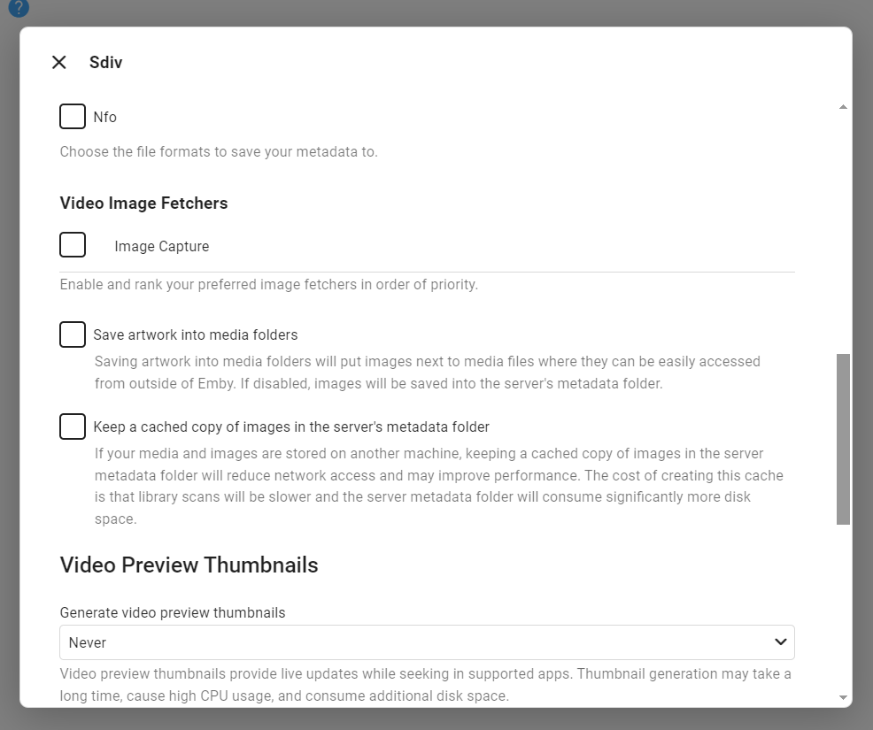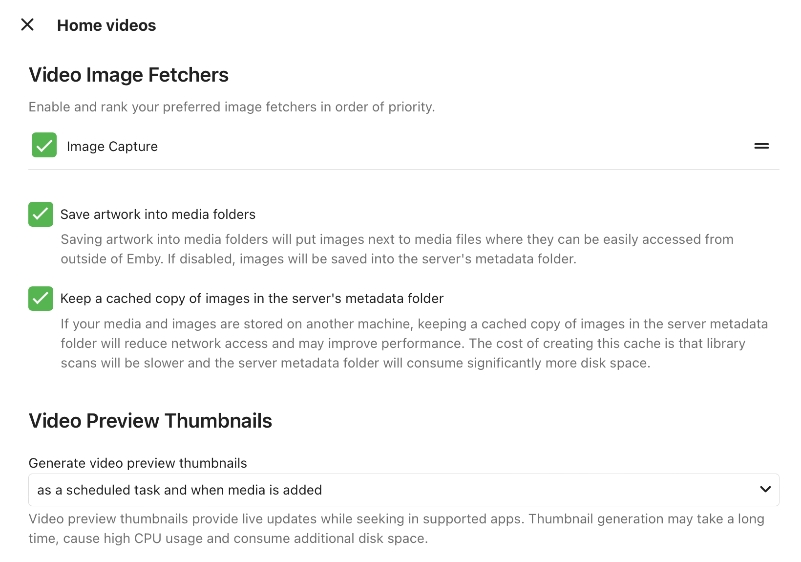 Happy2Play 9780 Posted February 8, 2024 Posted February 8, 2024 5 minutes ago, SuperSport said: Ah. Nothing is checked (and i have no idea what, if anything, was checked prior to the server update). You need enable "Image Capture" if you want Emby to generate and image for you. But you will have to verify the options you want enabled on the library like writing nfo files and Preview images, where you want images stored. 1