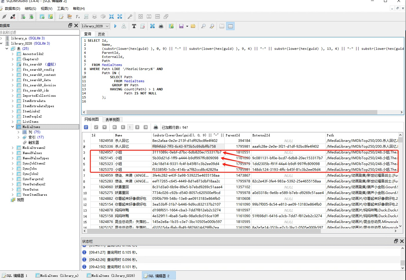 Luke 42077 Posted February 28, 2024 Posted February 28, 2024 8 minutes ago, wolong_zb said: Because the project data is large, it is not operated by deleting the media library for the time being; I delete all duplicate items by editing the library.db file using the following sql statement; Then re-scan refresh, can normally display a single item; But it reappeared the next day. After checking the log, the log describes that the task started at 04:10 and item was added again. After analyzing the mediaitems table in the database, it is found that among the duplicate items, the field externalId of the item added later points to the previous item, as shown in the figure below. del-same-items.txt 1.57 kB · 1 download embyserver-63844708508.txt 681.85 kB · 0 downloads The duplicate is caused by the watch history plugin as I mentioned in the other topic. Please remove that plugin and then you shouldn't see any new duplicates.