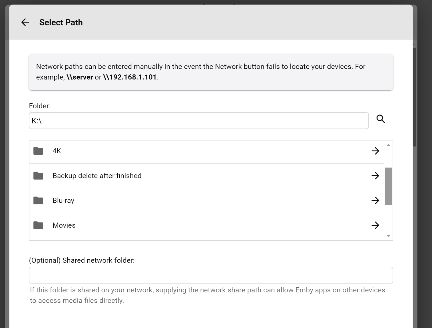 Trevor68 70 Posted February 10, 2024 Posted February 10, 2024 Can you take a screenshot of the dropdown you are referring to? Clearly if you cannot add your folder to the emby library then of course Emby will not play it. Can you manually add the path to the library, like type it in yourself?