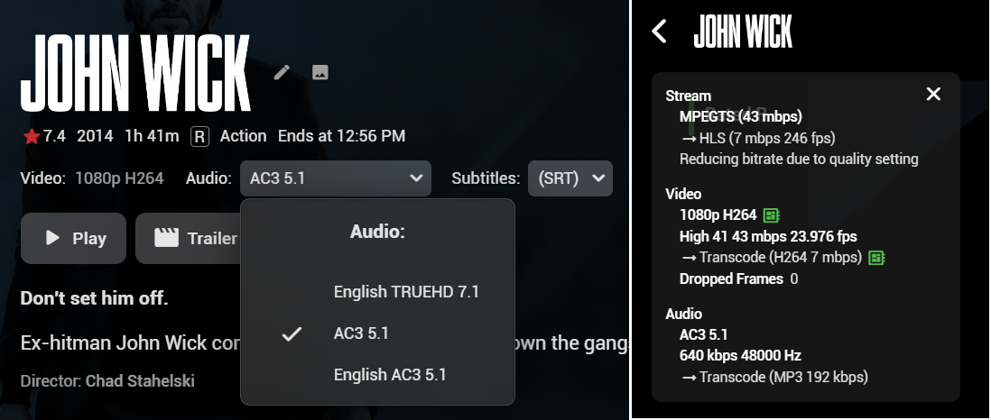 SamES 1056 Posted February 10, 2024 Posted February 10, 2024 1 hour ago, Hristo_Markow said: My LG 75UN7100 isn't playing with audio the movies from my library that are stored in M2TS format. Here is eac3to info of such file. eac3to Deadpool.m2ts M2TS, 1 video track, 1 audio track, 1:48:06, 24p /1.001 1: h264/AVC, 1080p24 /1.001 (16:9) 2: TrueHD/AC3 (Atmos), English, 7.1 channels, 48kHz (embedded: AC3, 5.1 channels, 640kbps, 48kHz) if I choose from Audio: drop down "AC3 5.1" the client shows Direct play, but there is no audio if I choose "English TRUEHD 7.1" there is an audio, but the server starts FFMPEG to transcode. I know the easy solution as advice "Convert your M2TS movies to MKV", but the collection contains 61 titles, I've already did it once for the LG's TV to append separate AC3 track. I wish not to do it again So eac3to is only reporting one audio track, but Emby is detecting two audio tracks?