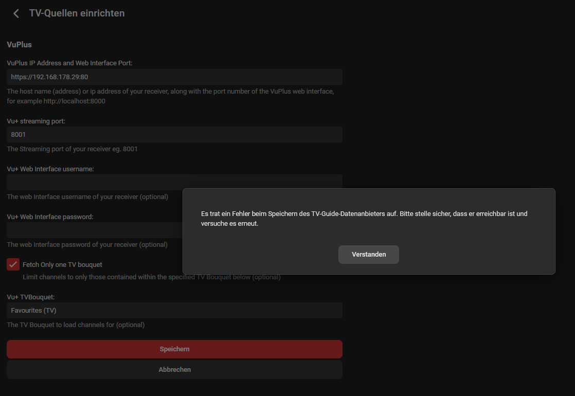 tomadick 8 Posted February 11, 2024 Posted February 11, 2024 Hello, I get the following link for a playlist from my Dreambox Sat Receiver: https://192.168.178.29/web/services.m3u?bRef=1%3A7%3A1%3A0%3A0%3A0%3A0%3A0%3A0%3A0%3AFROM%20BOUQUET%20%22userbouquet.favourites.tv%22%20ORDER%20BY%20bouquet When I enter this in emby, I get the error message: "An error occurred while saving the TV Guide data provider. Please make sure it is accessible and try again." If I enter the link in a browser or use the Synology Download Station, for example, the link works perfectly. I can of course download the m3u and read it into emby manually - it works perfectly. However, I would like to use it automatically as a link. Do you have any idea how I could also read it into emby? Thomas