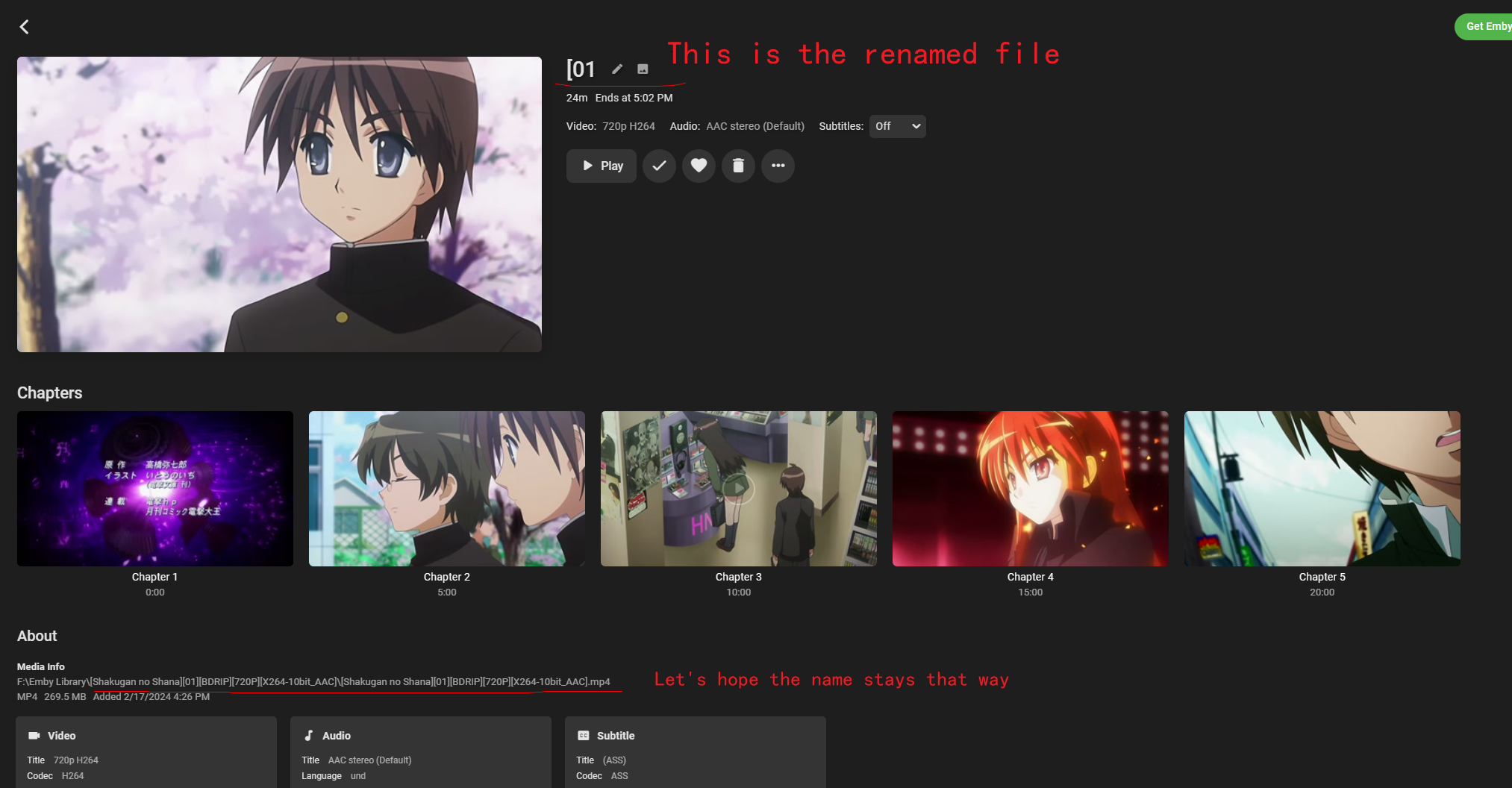 erwer 0 Posted February 17, 2024 Posted February 17, 2024 After emby scanned the file, the video was renamed operating system Windows 10 IoT LTSC emby version Version 4.8.1.0 Brief description of problem After emby scanned the file, it was renamed. Specific description After creating a new library in Libraries and selecting Music videos as the Content Type, the file name displayed in the scanned video file will be renamed. However, I do not need to rename the scanned video file. I just want to keep the original one. solution Want to add an option to let the user choose whether to rename the video file according to a certain rule, or stop renaming the file name and use the original file name, which is a problem in this version, previously it was displayed by the file name.