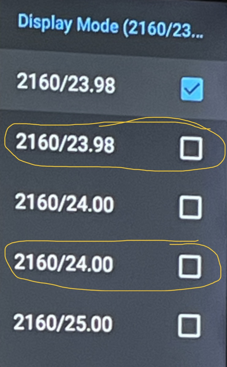 freddyfinn 9 Posted February 18, 2024 Posted February 18, 2024 (edited) I have an issue with the app not switching refresh rate correctly. The screen flickers then reports it is using the correct refresh rate yet the picture stutters badly. When I go into settings > display mode I get duplicate refresh rates see pictures. This doesn’t happen on my Nvidia Shield units. if I select the second refresh rate the screen flickers again and changes correctly and playback is smooth. Eg switch from 2160/23.98 to the same below. The only time it doesn’t do it is when you match content resolution and resolution is below 2160p. Duplicate refresh rates are constantly there as are various others at 2160p. Edited February 18, 2024 by freddyfinn Spelling