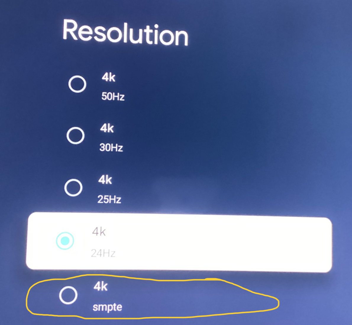 freddyfinn 9 Posted June 2, 2024 Author Posted June 2, 2024 17 hours ago, Luke said: Hi, what do you mean by change it manually? Change what exactly? @Lukeas per the pictures I posted earlier showing duplicated resolutions if I move the resolution to the second duplicate manually the TV switches to full resolution of 4096x2160p True 4K as opposed to 3840x2160p UHD The circled resolutions below are 4096p however I have to pop up settings in the player and select them manually. I believe 4096p is only available on the Google TV when the TV supports enhanced HDMI. When it does another resolution becomes available in the Google TV settings which is 4K smpte which is exclusively for full 4096p or True 4K. If the TV does not support enhanced HDMI @4096p there will be no duplicate entries in Emby and no 4K smpte available in the Google TV settings.