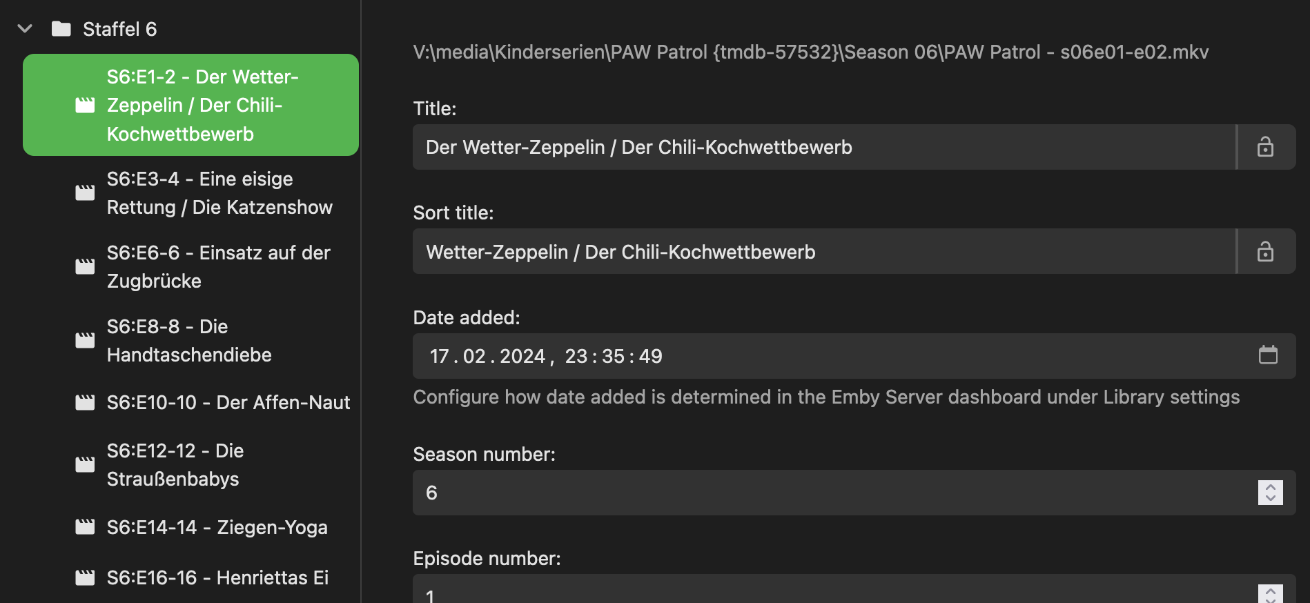 Guardian87 4 Posted February 18, 2024 Posted February 18, 2024 Hi Everyone, I have one show where every season lists the same episodes. Refreshing all metadata doesn't change anything for these files. I haven't tried to remove all the files and add them again yet, but that is the only idea left for me. I still wanted to bring it up. The log doesn't show a lot of information: Quote 2024-02-18 08:37:01.609 Info HttpClient: GET https://api4.thetvdb.com/v4/episodes/6317776/extended 2024-02-18 08:37:01.870 Info HttpClient: GET https://api4.thetvdb.com/v4/episodes/6322959/extended 2024-02-18 08:37:01.875 Info LibraryMonitor: Staffel 4 (V:\media\Kinderserien\PAW Patrol {tmdb-57532}\Season 04) will be refreshed. 2024-02-18 08:37:01.879 Info LibraryMonitor: Staffel 4 (V:\media\Kinderserien\PAW Patrol {tmdb-57532}\Season 04) will be refreshed. 2024-02-18 08:37:01.882 Info LibraryMonitor: Staffel 4 (V:\media\Kinderserien\PAW Patrol {tmdb-57532}\Season 04) will be refreshed. 2024-02-18 08:37:01.951 Info LibraryMonitor: Staffel 4 (V:\media\Kinderserien\PAW Patrol {tmdb-57532}\Season 04) will be refreshed. 2024-02-18 08:37:02.001 Info LibraryMonitor: Staffel 4 (V:\media\Kinderserien\PAW Patrol {tmdb-57532}\Season 04) will be refreshed. 2024-02-18 08:37:02.015 Info LibraryMonitor: Staffel 4 (V:\media\Kinderserien\PAW Patrol {tmdb-57532}\Season 04) will be refreshed. 2024-02-18 08:37:02.064 Info HttpClient: GET https://api4.thetvdb.com/v4/episodes/6177807/extended 2024-02-18 08:37:02.091 Info LibraryMonitor: Staffel 4 (V:\media\Kinderserien\PAW Patrol {tmdb-57532}\Season 04) will be refreshed. 2024-02-18 08:37:02.110 Info LibraryMonitor: Staffel 4 (V:\media\Kinderserien\PAW Patrol {tmdb-57532}\Season 04) will be refreshed. 2024-02-18 08:37:02.112 Info LibraryMonitor: Staffel 4 (V:\media\Kinderserien\PAW Patrol {tmdb-57532}\Season 04) will be refreshed. 2024-02-18 08:37:02.139 Info LibraryMonitor: Staffel 4 (V:\media\Kinderserien\PAW Patrol {tmdb-57532}\Season 04) will be refreshed. 2024-02-18 08:37:02.264 Info LibraryMonitor: Staffel 4 (V:\media\Kinderserien\PAW Patrol {tmdb-57532}\Season 04) will be refreshed. 2024-02-18 08:37:02.306 Info LibraryMonitor: Staffel 4 (V:\media\Kinderserien\PAW Patrol {tmdb-57532}\Season 04) will be refreshed. 2024-02-18 08:37:02.327 Info LibraryMonitor: Staffel 4 (V:\media\Kinderserien\PAW Patrol {tmdb-57532}\Season 04) will be refreshed. 2024-02-18 08:37:02.331 Info LibraryMonitor: Staffel 4 (V:\media\Kinderserien\PAW Patrol {tmdb-57532}\Season 04) will be refreshed. 2024-02-18 08:37:02.334 Info LibraryMonitor: Staffel 4 (V:\media\Kinderserien\PAW Patrol {tmdb-57532}\Season 04) will be refreshed. 2024-02-18 08:37:02.338 Info LibraryMonitor: Staffel 4 (V:\media\Kinderserien\PAW Patrol {tmdb-57532}\Season 04) will be refreshed. 2024-02-18 08:37:02.339 Info HttpClient: GET https://api4.thetvdb.com/v4/episodes/6145799/extended 2024-02-18 08:37:02.497 Info LibraryMonitor: Staffel 4 (V:\media\Kinderserien\PAW Patrol {tmdb-57532}\Season 04) will be refreshed. 2024-02-18 08:37:02.534 Info HttpClient: GET https://api4.thetvdb.com/v4/episodes/6307069/extended 2024-02-18 08:37:02.699 Info LibraryMonitor: Staffel 4 (V:\media\Kinderserien\PAW Patrol {tmdb-57532}\Season 04) will be refreshed. 2024-02-18 08:37:02.883 Info HttpClient: GET https://api4.thetvdb.com/v4/episodes/6322094/extended 2024-02-18 08:37:02.963 Info LibraryMonitor: Staffel 4 (V:\media\Kinderserien\PAW Patrol {tmdb-57532}\Season 04) will be refreshed. 2024-02-18 08:37:02.967 Info LibraryMonitor: Staffel 4 (V:\media\Kinderserien\PAW Patrol {tmdb-57532}\Season 04) will be refreshed. 2024-02-18 08:37:02.996 Info LibraryMonitor: Staffel 4 (V:\media\Kinderserien\PAW Patrol {tmdb-57532}\Season 04) will be refreshed. 2024-02-18 08:37:02.998 Info LibraryMonitor: Staffel 4 (V:\media\Kinderserien\PAW Patrol {tmdb-57532}\Season 04) will be refreshed. 2024-02-18 08:37:03.086 Info LibraryMonitor: Staffel 4 (V:\media\Kinderserien\PAW Patrol {tmdb-57532}\Season 04) will be refreshed. 2024-02-18 08:37:03.272 Info LibraryMonitor: Staffel 4 (V:\media\Kinderserien\PAW Patrol {tmdb-57532}\Season 04) will be refreshed. 2024-02-18 08:37:03.273 Info LibraryMonitor: Staffel 4 (V:\media\Kinderserien\PAW Patrol {tmdb-57532}\Season 04) will be refreshed. 2024-02-18 08:37:03.275 Info HttpClient: GET https://api4.thetvdb.com/v4/episodes/6383137/extended 2024-02-18 08:37:03.471 Info LibraryMonitor: Staffel 4 (V:\media\Kinderserien\PAW Patrol {tmdb-57532}\Season 04) will be refreshed. 2024-02-18 08:37:03.516 Info HttpClient: GET https://api4.thetvdb.com/v4/episodes/6501860/extended 2024-02-18 08:37:03.732 Info HttpClient: GET https://api4.thetvdb.com/v4/episodes/6501864/extended 2024-02-18 08:37:03.955 Info HttpClient: GET https://api4.thetvdb.com/v4/episodes/6518988/extended 2024-02-18 08:37:04.161 Info HttpClient: GET https://api4.thetvdb.com/v4/episodes/6515390/extended 2024-02-18 08:40:24.531 Info LibraryMonitor: Staffel 5 (V:\media\Kinderserien\PAW Patrol {tmdb-57532}\Season 05) will be refreshed. 2024-02-18 09:09:55.077 Info Server: http/1.1 POST http://host1:8096/emby/Sessions/Capabilities/Full?X-Emby-Client=Emby Web&X-Emby-Device-Name=Firefox macOS&X-Emby-Device-Id=4c02f2bf-b437-47b2-a7bd-d7a6bcd80f4b&X-Emby-Client-Version=4.8.1.0&X-Emby-Token=x_secret5_x&X-Emby-Language=en-us&reqformat=json. UserAgent: Mozilla/5.0 (Macintosh; Intel Mac OS X 10.15; rv:122.0) Gecko/20100101 Firefox/122.0 2024-02-18 09:09:55.083 Info Server: http/1.1 Response 204 to host6. Time: 6ms. POST http://host1:8096/emby/Sessions/Capabilities/Full?X-Emby-Client=Emby Web&X-Emby-Device-Name=Firefox macOS&X-Emby-Device-Id=4c02f2bf-b437-47b2-a7bd-d7a6bcd80f4b&X-Emby-Client-Version=4.8.1.0&X-Emby-Token=x_secret5_x&X-Emby-Language=en-us&reqformat=json 2024-02-18 09:09:55.995 Info App: Sqlite: 284 - automatic index on LastWatchedEpisodes(SeriesPresentationUniqueKey) 2024-02-18 09:10:54.426 Info Server: http/1.1 POST http://host1:8096/emby/Sessions/Capabilities/Full?X-Emby-Cl