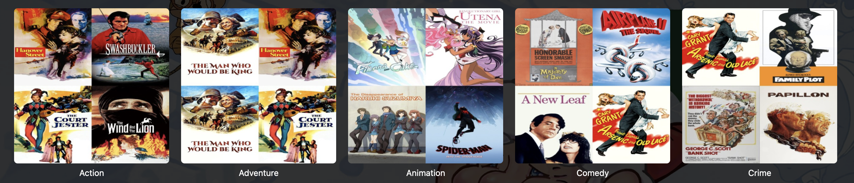 acbarrentine 1 Posted February 20, 2024 Author Posted February 20, 2024 (edited) That put an image on there, but it wasn't what I was expecting. At a guess, I'd say it's digging up the original frozen images from someplace, even after I deleted them. To explain, I should give some history. I started this server off with a bunch of DVD rips from my mother's library. It stayed primarily that for a long time. Recently, I have been adding a bunch of my own movies and shows, and now probably 3/4 of the content is new/mine. The genre images I'm calling frozen were showing only stuff from my mother's DVDs. I'm including a little snippet of the newly generated genre images. 4/5 of them are entirely the old stuff. I experimented with deleting/regenerating them a second time, and each time they come up identical. I'd think that could be a fixed rand seed, but that can't be entirely it, because it's ignoring the newer top-level folders entirely. I think instead it must be finding the old images somewhere and re-using them. The "Animation" genre is the exception here, where it's finding newer stuff. I presume that's because there WAS no "Animation" genre when the freeze occurred. It also keeps regenerating that same image, if I delete it and do the refresh metadata operation. Edited February 20, 2024 by acbarrentine