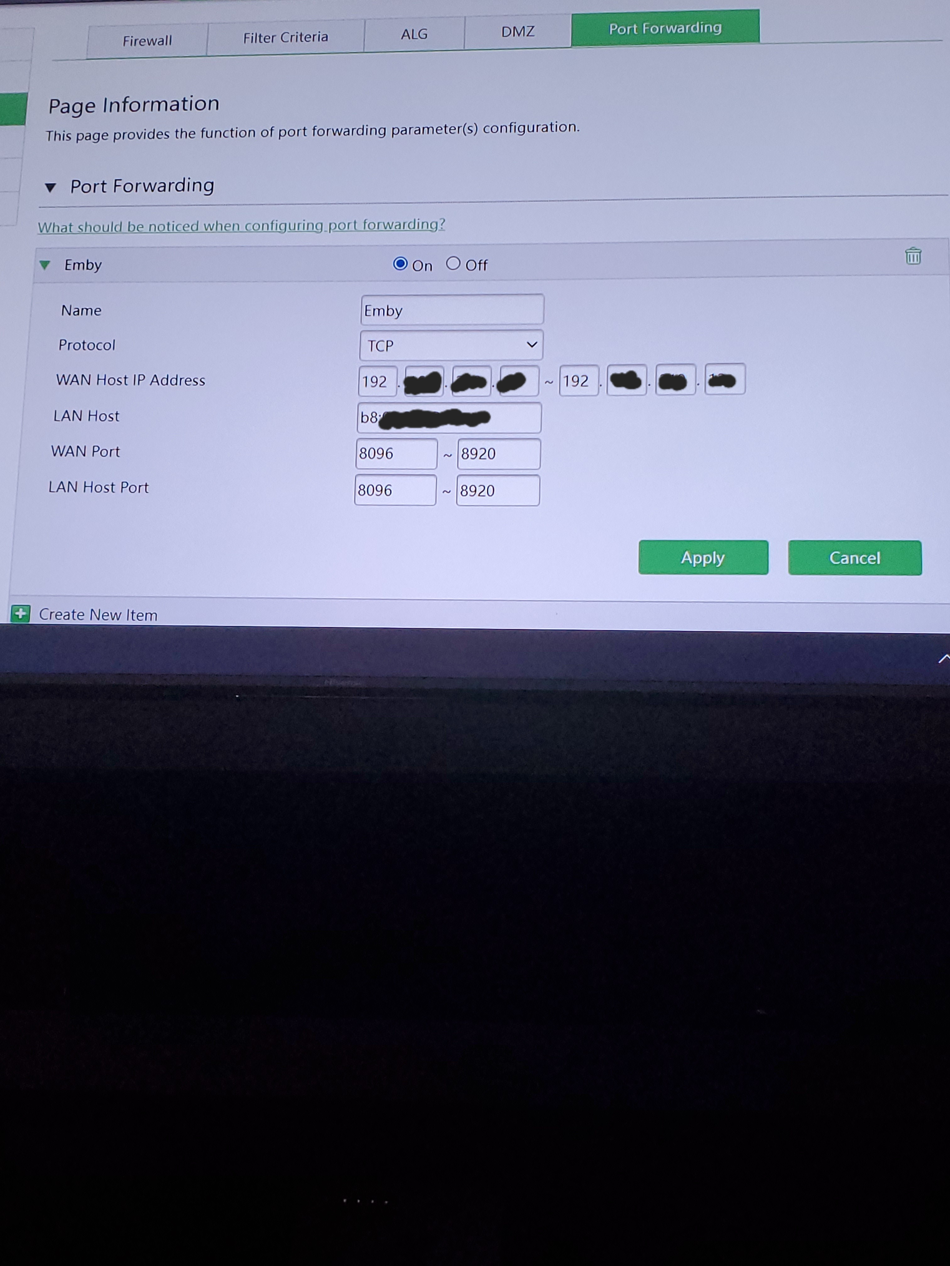 lil-duke 3 Posted February 27, 2024 Posted February 27, 2024 I enable automatic port mapping in settings when I go to my routers setting under UPnP portmap table it shows the 2 ports. Pictured below. But I'm still not able to connect to emby remotely. Ive tried setting up port forwarding but that doesn't work either. I posted picture hopefully someone knows how to configure this. In port forwarding I did put the Mac address (laptop) for LAN host. Not really sure how to set this up on this router Does anyone know how to get around this? I'm pretty good with tech but Im very limited when it comes to anything about internet.