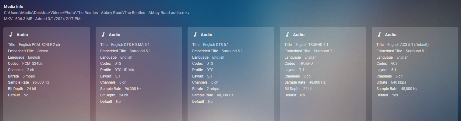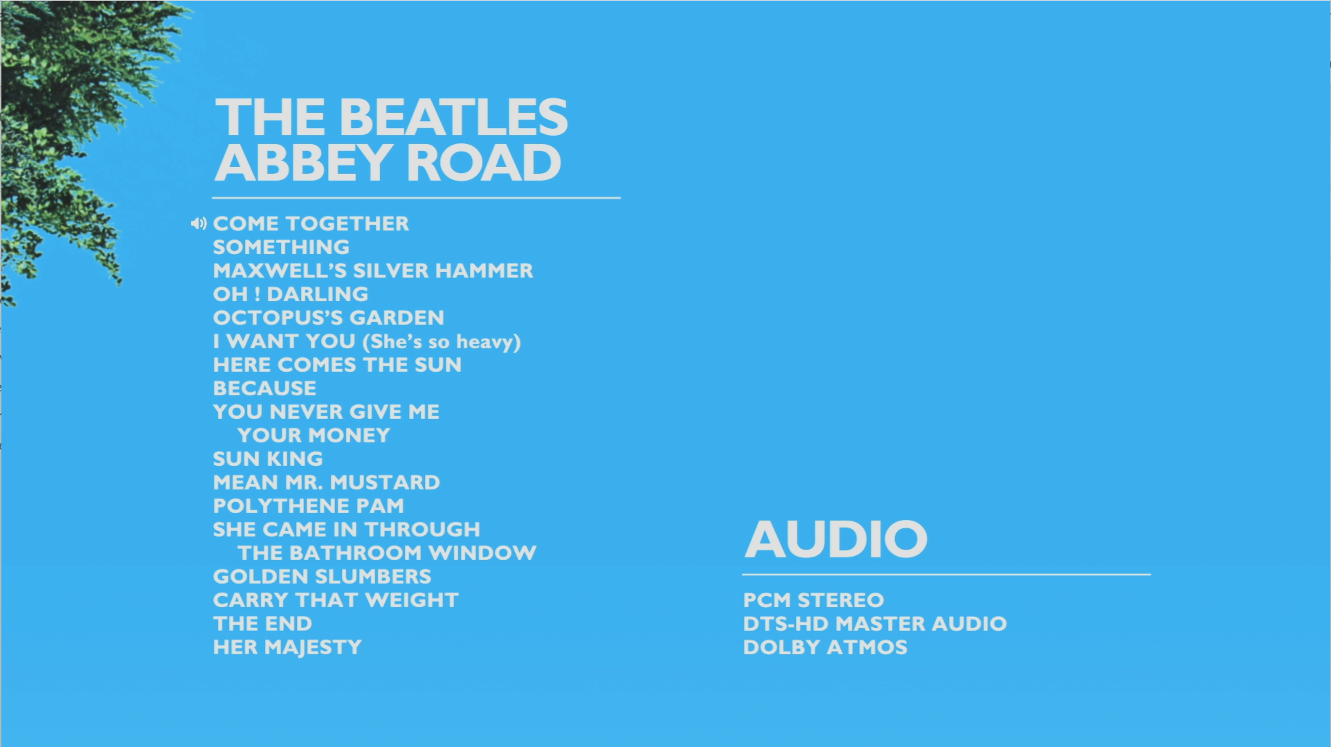 SteveFintel 30 Posted March 1, 2024 Author Posted March 1, 2024 What's actually on the BD Audio disks are (usually) music that has been encoded in high bandwidth audio tracks. It usually also includes some video to go along with it, but that is usually something along the lines of an animated album cover. Here's an example: The Beatles Abbey Road in BD Audio has the entire album with chapter markers for each of the 17 tracks on the album. There is a single 1080p video stream that has a tree waving in the wind and occasional birds flying by on a loop and the speaker icon (shown below next to Come Together) moves to highlight the playing track. There are 5 audio streams: 24/96 Stereo, DTS-HD MA 24/96 5.1, DTS 24/48 5.1, MLP Atmos 24/48 7.1 and DD 5.1. There is also a separate program track that has the official music video for George Harrison's Something with 2 audio tracks. I have tried splitting the the MKV into MKA files which preserves the advanced codecs and allows me to insert the individual tracks into my music library, but that is a large PITA that I would like to avoid. Musicbrainz.org contains full information for the BluRay (https://musicbrainz.org/release/5c700b4e-949e-40a4-a363-7841d8195a50) so I think there's a way for Emby Server to handle this content