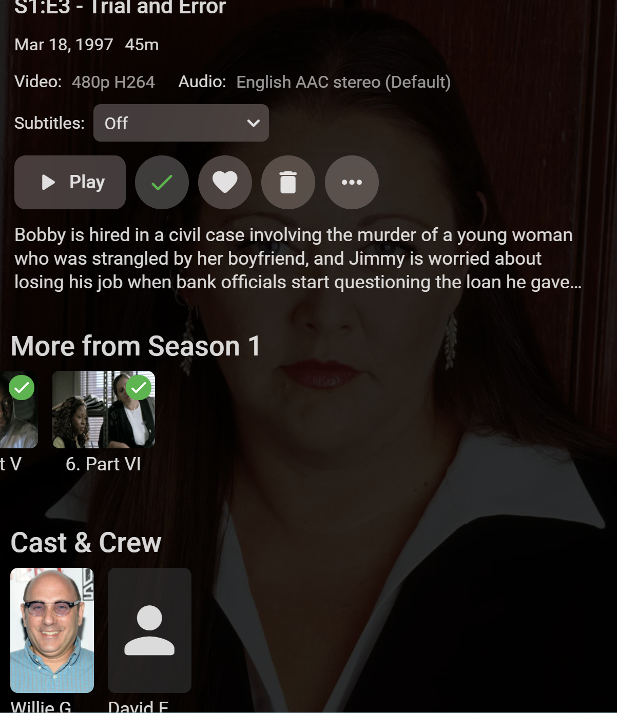 jglazer63 22 Posted March 10, 2024 Author Posted March 10, 2024 Here is a screenshot of The Practice, Season 1 Episode 3. You'll note it doesn't show ANY main characters and only 1 actor and writer.