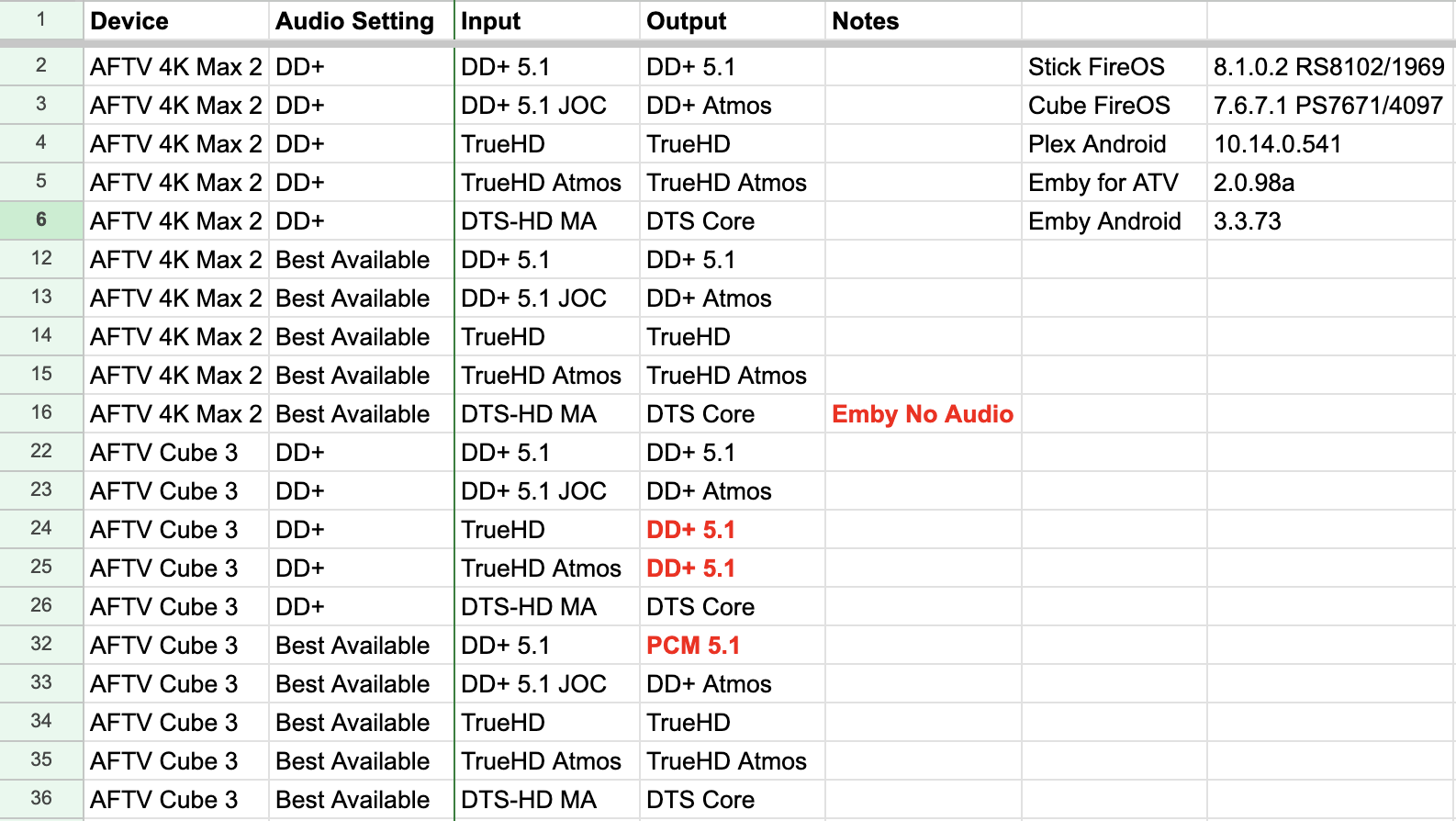 signde 26 Posted May 12, 2024 Posted May 12, 2024 It has been almost 8 weeks and I still cannot play DTS audio in the official Emby for Android TV app on the 4K fire stick. I am guessing the ATV app is abandonware are this point as the latest release is 2.1.10 yet the fireOS store still has 2.0.98a as latest. I also recently picked up a 3rd gen Cube. I was surprised to see it actually does play DTS-HD MA as DTS Core however there are some funny differences between playback of the two devices depending on the fireOS audio options. Here are my findings across both Plex and Emby: From what I can see, the latest stick in these apps will passthrough all these formats no matter which of these two audio settings you use. The cube however, there is no magic setting that will passthrough all of these formats in either app. If you choose DD+, TrueHD will get converted to DD+. If you choose Best Available, non Atmos DD+ gets converted to PCM. You can also see that I tried the latest non ATV, regular Android Emby app with the stick and yet still, no DTS audio. I'm unable to test any other versions of Emby for ATV because while I have unlocked the ATV app through the Amazon store, you can't install a beta over it. Side loading the app gives me a version of the app that isn't unlocked, and won't let me play anything.