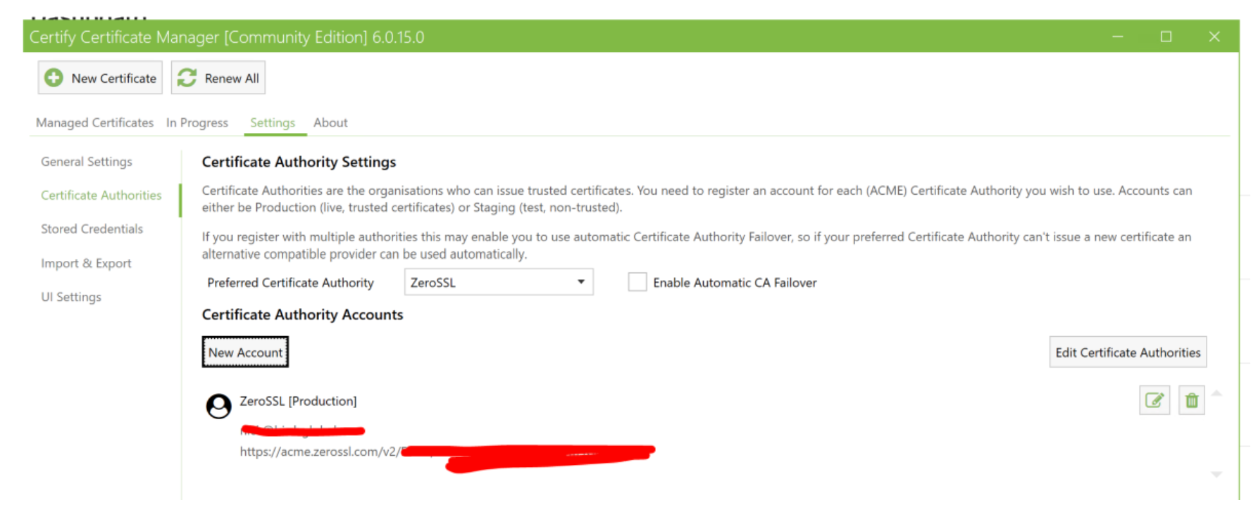 djerniehoule 23 Posted March 20, 2024 Author Posted March 20, 2024 I have installed CTW, I don't see where to do this... 5b - tell CTW about Zerosll under CTW...settings....set the preferred certificate authority and add new account..this is what mine looks like.