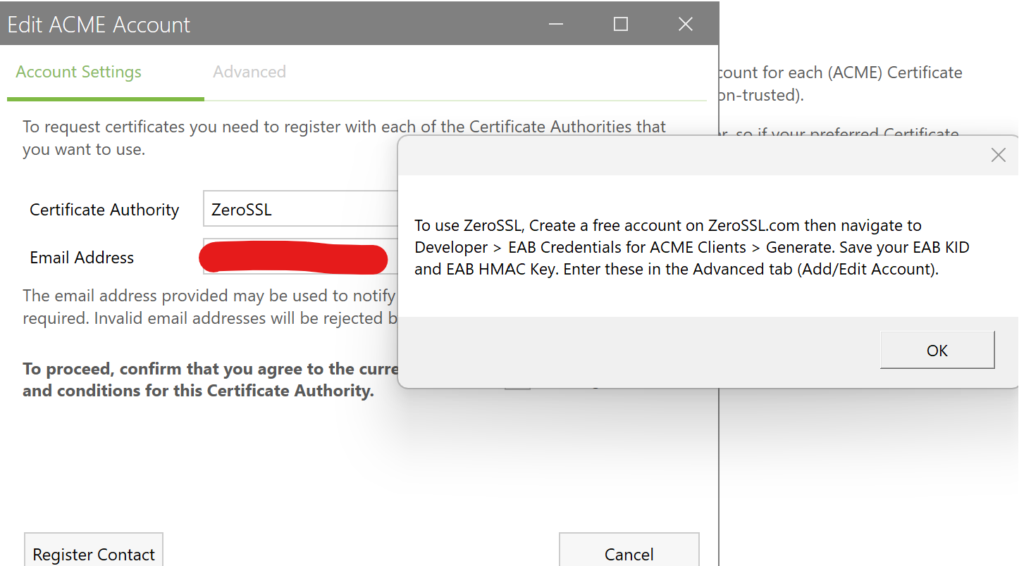 ginjaninja 605 Posted March 20, 2024 Posted March 20, 2024 Ok its say what to do.. when you click register contact Go to zero ssl, login to your account, go to developer and click gnerate - this will generate a keyid and key (hmac) which you enter on advanced tab on the new account in CTW. im not going to click generate myself as it will probably change my config, but hopefully when you click it...the result will be obvious.. you can enter the information and click register in ctw...