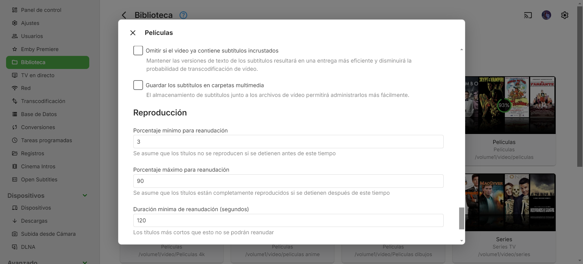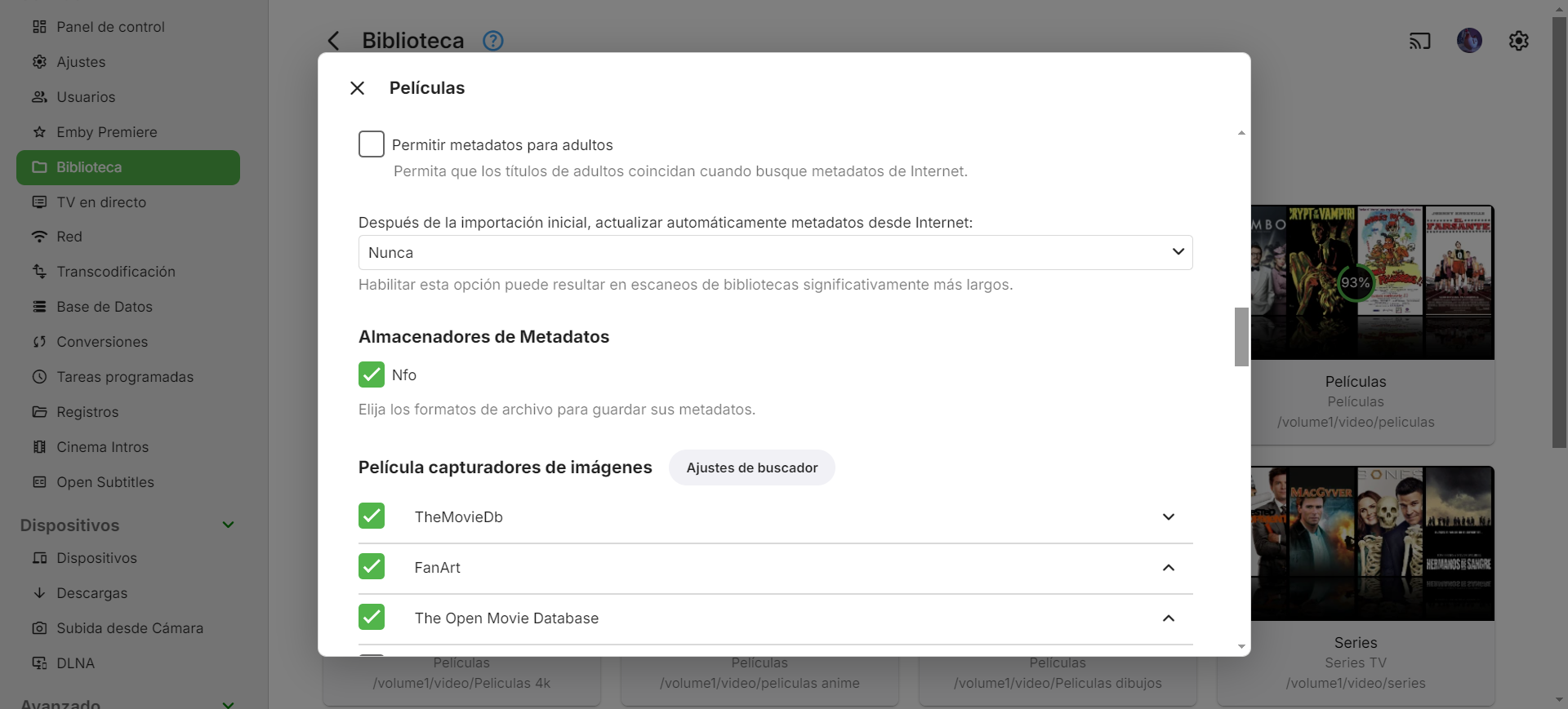 Mibok 158 Posted May 14, 2024 Posted May 14, 2024 On 5/13/2024 at 1:11 AM, bjgrimm said: Ya revisé todos los discos y están ok, después de probar de todo parece que ya funciona bien. Creo que el problema era que cuando hay varios elementos que no consigue identificar parece que se vuelve loco y el escaneo dura muchísimo más, casi diría que a veces ni termina, está días enteros escaneando. Por cierto quería preguntar también como hacer que una vez que elijo las imágenes de una película no cambien nunca? las portadas cambian a veces por otras que no he elegido yo, es normal? Eso podría ser que tengas la biblioteca configurada para que actualice metadatos periódicamente, esto lo puedes ver en la configuración de cada biblioteca aunque los intervalos marcados ahí son muy grandes (30, 60 y 90 días) como para que ese sea tu problema. Otra cosa que puedes intentar es habilitar si es que no tienes ya habilitada la opción para que se guarden las imágenes dentro de las carpetas de medios, eso también podría ayudar a acelerar un poco el escaneo futuro en la biblioteca si llegaras a reconstruirla desde cero. 1