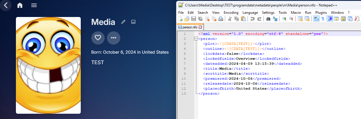 Happy2Play 9780 Posted October 6, 2024 Posted October 6, 2024 (edited) I am not sure as I had no issues adding "Media" to anything and applying overview, Birthday/Place. 2024-10-06 08:47:05.135 Debug SqliteItemRepository: GetitemById Person 29297 Media 2024-10-06 08:47:05.143 Debug App: Saving nfo metadata for Media to C:\Users\Media\Desktop\TEST\programdata\metadata\people\m\Media\person.nfo. Edited October 6, 2024 by Happy2Play