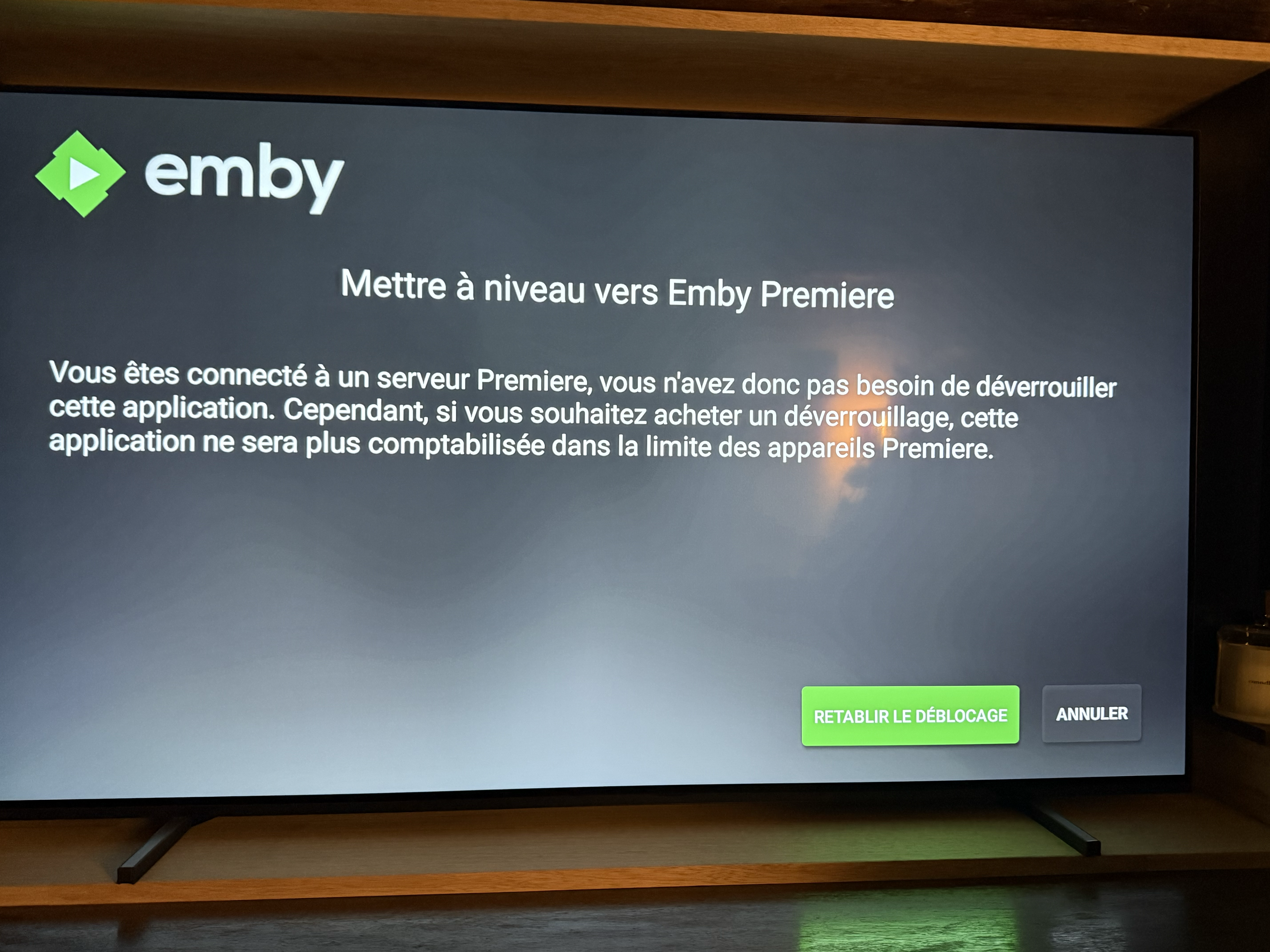 GrimReaper 4739 Posted April 8, 2024 Posted April 8, 2024 If you installed Emby for AndroidTV app - you can Unlock app (one-time fee). If you installed standard Emby for Android app - it requires active Premiere subscription for use on TV devices (App unlock is available only on mobile devices).