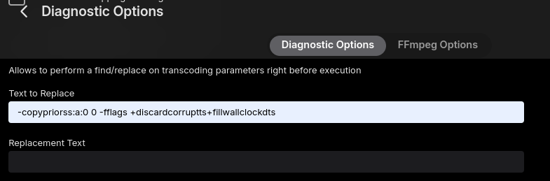 Luke 42077 Posted May 10, 2024 Posted May 10, 2024 OK can you install 4.8 and then the diagnostics plugin. The plugin has a method to alter our ffmpeg command line via search and replace. Let's try a few things and we should be able to get to the bottom of this. Please do a search and replace on this: -copypriorss:a:0 0 -fflags +discardcorruptts+fillwallclockdts And just replace it with empty. If that doesn't help, then try each of these individually, each time replacing them with empty: -reconnect_on_network_error 1 then -reconnect_on_http_error 5xx,4xx Please note all three of these search strings have a blank space at the beginning and no space at the end. Let's see if one of these three resolves it. Thanks.