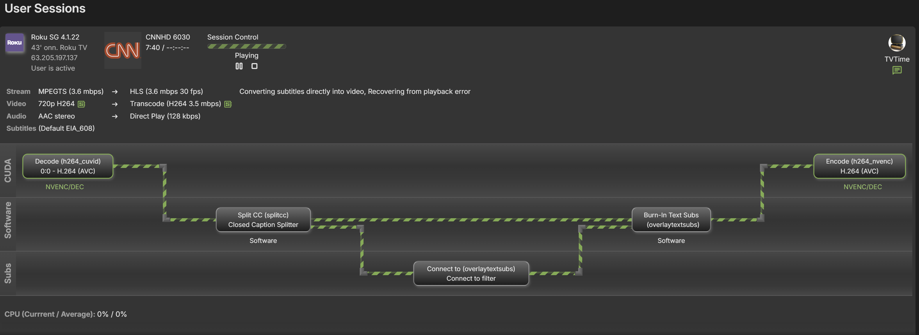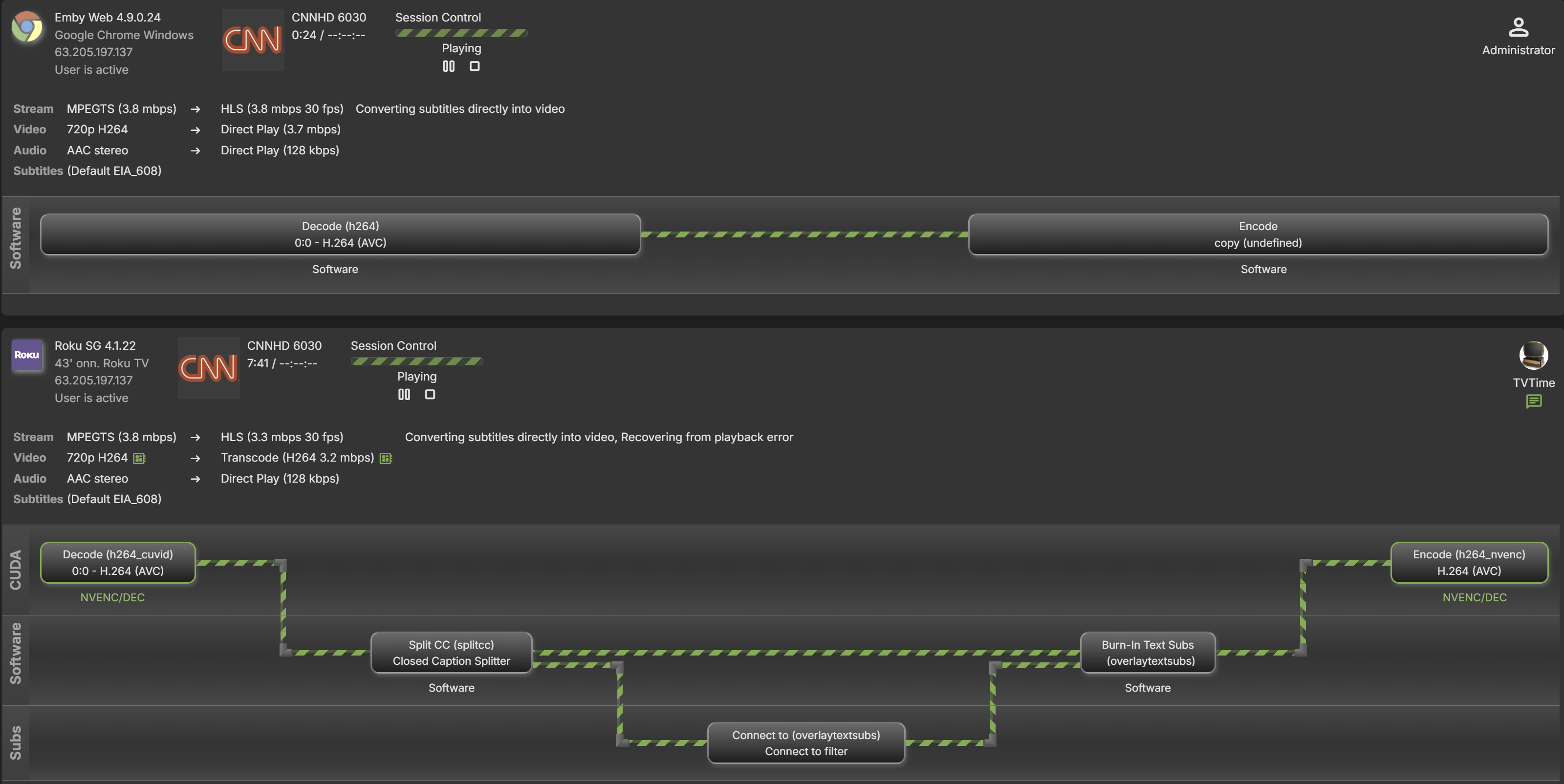 Sammy 790 Posted June 11, 2024 Posted June 11, 2024 23 hours ago, ebr said: The captions don't display in that app either, correct? According to your log, these are the type of captions that Exo simply doesn't "see" for some reason. 22 hours ago, Sammy said: Captions are displaying in Channels DVR but not Emby Android, IOS, AndroidTV or Windows apps. I connected via an Onn Roku TV. Here's the graph: And the logs: Server and Transcode Logs.zip