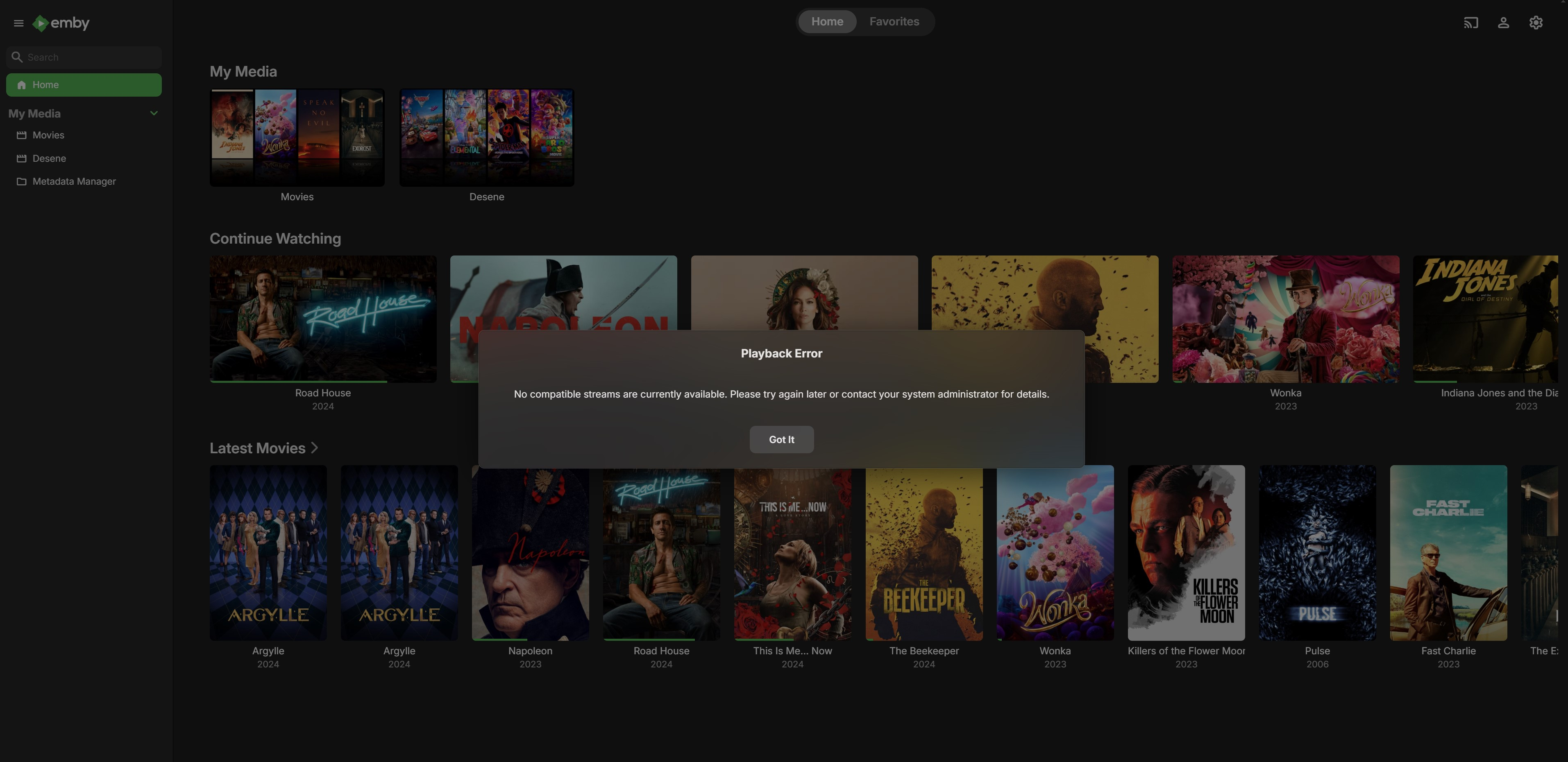 infinitynet 0 Posted April 21, 2024 Posted April 21, 2024 (edited) Hello, I am not sure if there is support for Emby Premiere version 4.8.4.0 I have this issue with one movie. Playback Error No compatible streams are currently available. Please try again later or contact your system administrator for details The logs are: [segment @ 00000260783c7dc0] Opening 'C:\Users\X\AppData\Roaming\Emby-Server\programdata\transcoding-temp\132803\132803_s7.m3u8.tmp' for writing SegmentComplete=video:1 Index=7 Start=21.146125 End=23.523500 Duration=2.377375 offset_pts=0 start_pts=21146125 Frames=60 filename=132803_s7_7.vtt elapsed=00:00:01.04 frame= 562 fps=536 q=8.0 Lq=-1.0 q=-1.0 q=-1.0 q=-1.0 q=-1.0 q=-1.0 size=N/A time=00:00:00.16 bitrate=N/A throttle=off speed=0.159x video:60999kB audio:147kB subtitle:0kB other streams:0kB global headers:0kB muxing overhead: unknown EXIT Attached full log ffmpeg-transcode Thank you, Gabe ffmpeg-transcode-572568fc-0ca5-442b-99bd-dd0fb98daee5_1.txt Edited April 21, 2024 by infinitynet