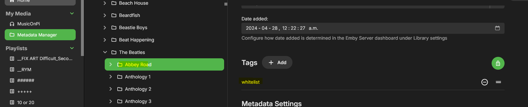 jazztrance 0 Posted May 15, 2024 Author Posted May 15, 2024 Also noticed something that indicates there's something recognizing the album tag. I have the beatles tagged with 'whitelist' and abbey road tagged with 'whitelist'. The list of songs under the beatles in artist view is all of their songs but it's ordered so abbey road songs are listed first in alphabetical and then the rest are listed in alphabetical order