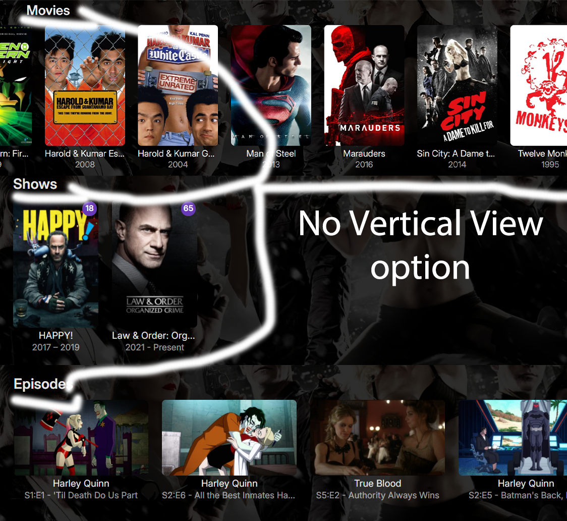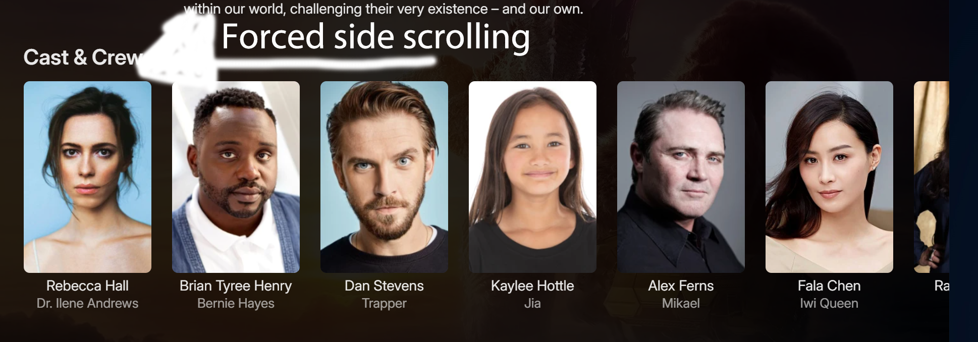 Smitty018210 143 Posted May 27, 2024 Author Posted May 27, 2024 (edited) @Luke Where is this setting? How about a screen shot? I am not sure you and I are talking about the same thing. I don't want to have to side scroll though long list of things. It's annoying. This is what I am talking about, and that is just and example of it. There are plenty of forced side scrolling through out the app. Here are just a few examples: (images below) For example: there is no way to view a full cast of movie in vertical view. You HAVE to scroll through the whole list of actors. Which could be 100+ people long. Anywhere there is forced horizontal/ side scroll I would like an option to view it vertically. Again I do not use Desktop/mobile Views modes. I do not care if there is an option for this in those modes! That dose not help me one bit. I use TV mode! With a remote control. Edited May 27, 2024 by Smitty018210