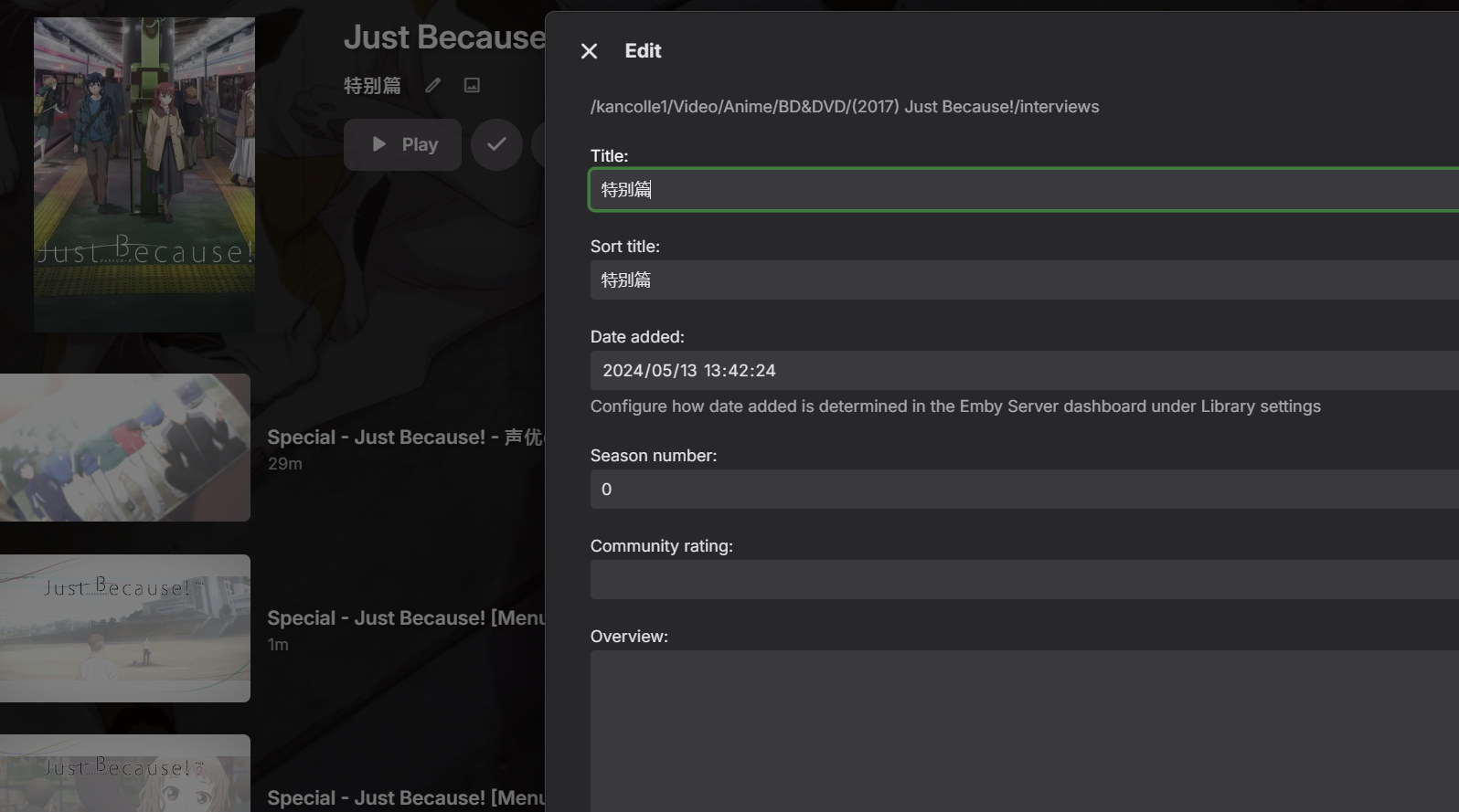 参照https://emby.media/support/articles/TV-Naming.html,我创建了extras和interviews文件夹用于放置动画的额外文件