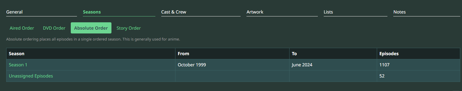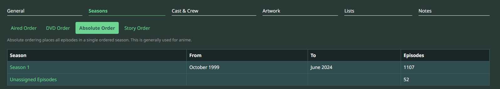 Neminem 1518 Posted May 27, 2024 Posted May 27, 2024 If using Absolute all episodes should be in 1 folder. Or is that failing ? Emby not going over 999 episodes, like the y2k bug.